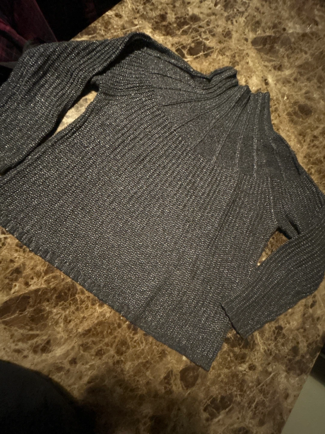 This is a sparkly grey ribbed sweater with a mock neck. It's made of a blend that feels comfortable. Great for adding a bit of shimmer to your outfit!