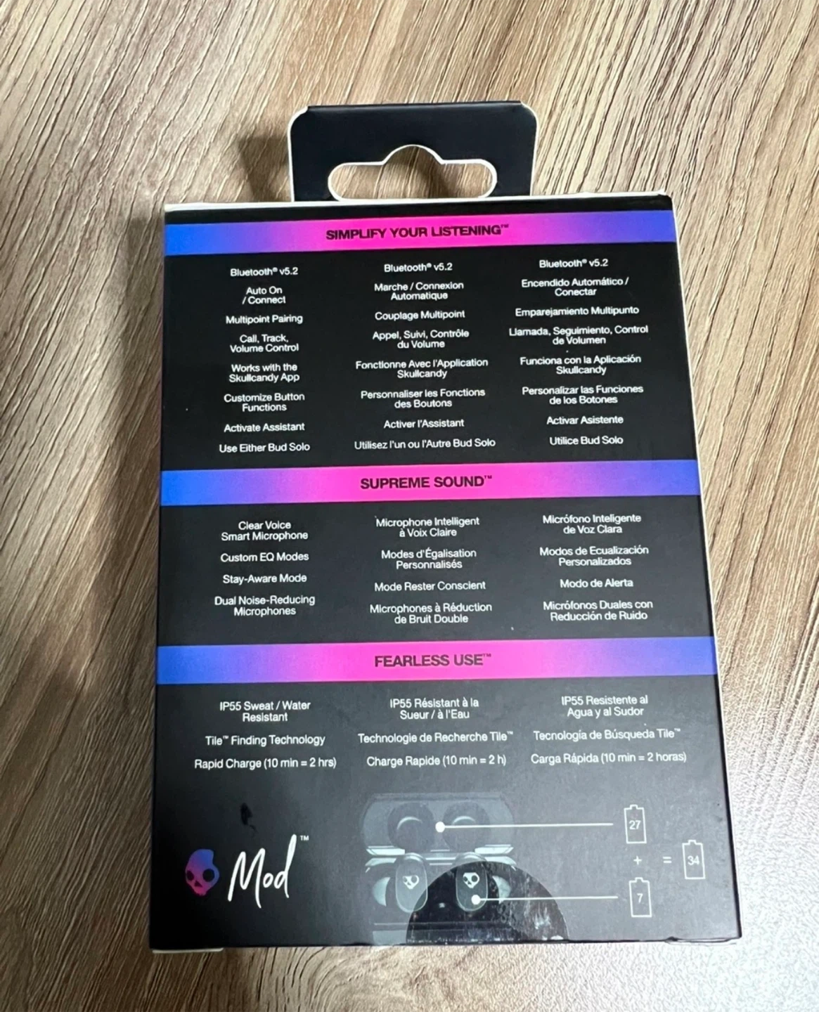 These Skullcandy Mod earbuds offer true wireless audio with a sweat and water-resistant IP55 rating. They provide up to 34 hours of total battery life and feature clear voice smart mics. Ear tips in sizes S, M, and L are included.
