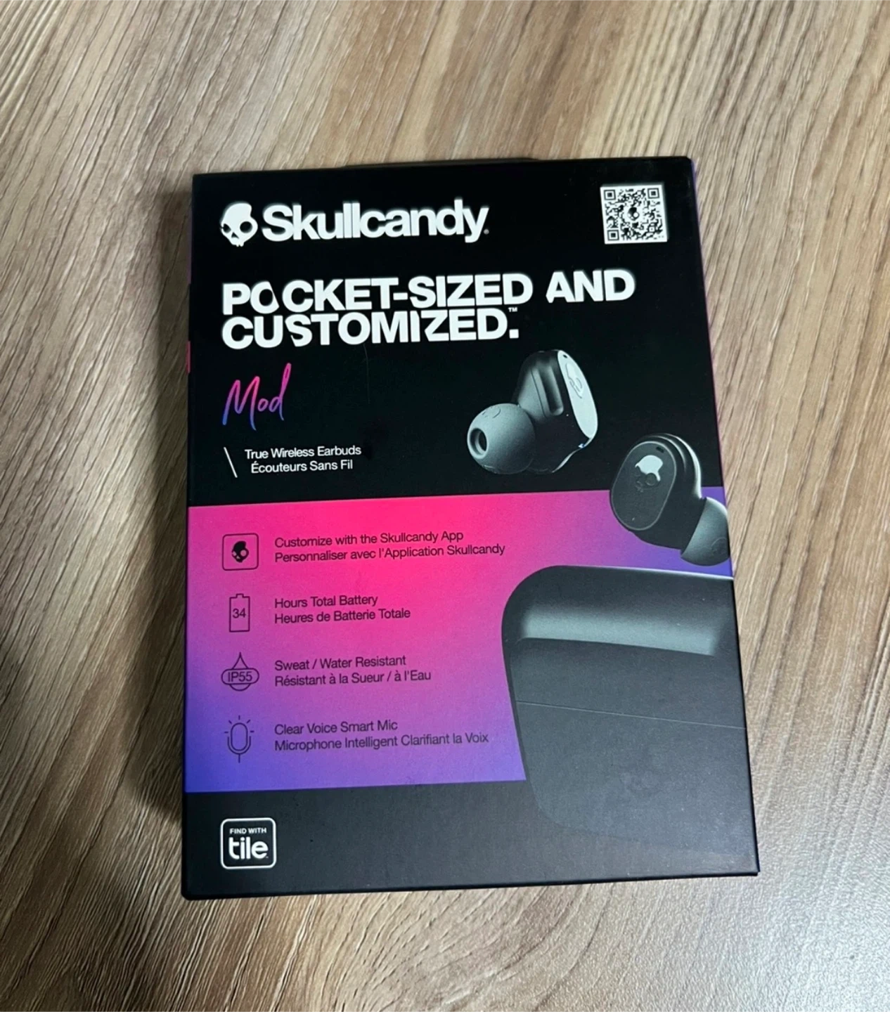 These Skullcandy Mod earbuds offer true wireless audio with a sweat and water-resistant IP55 rating. They provide up to 34 hours of total battery life and feature clear voice smart mics. Ear tips in sizes S, M, and L are included.