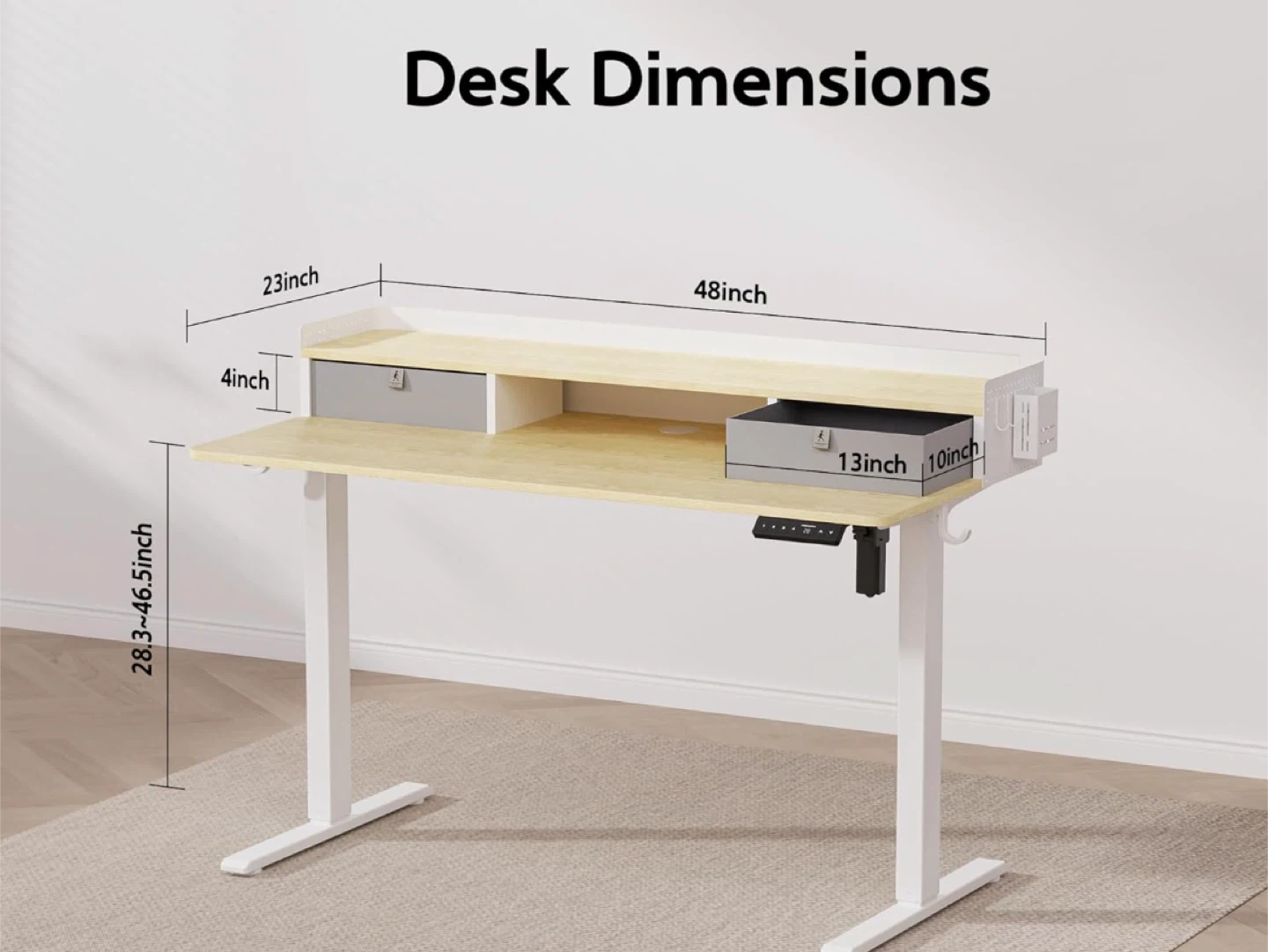 This standing desk has a large 48-inch surface and adjustable height from 28.3 to 46.5 inches. It includes two drawers for storage, with dimensions of 23 inches wide and 4 inches deep for the top one, and 13 inches wide by 10 inches deep for the lower one. The desk itself is 23 inches deep and 48 inches wide.