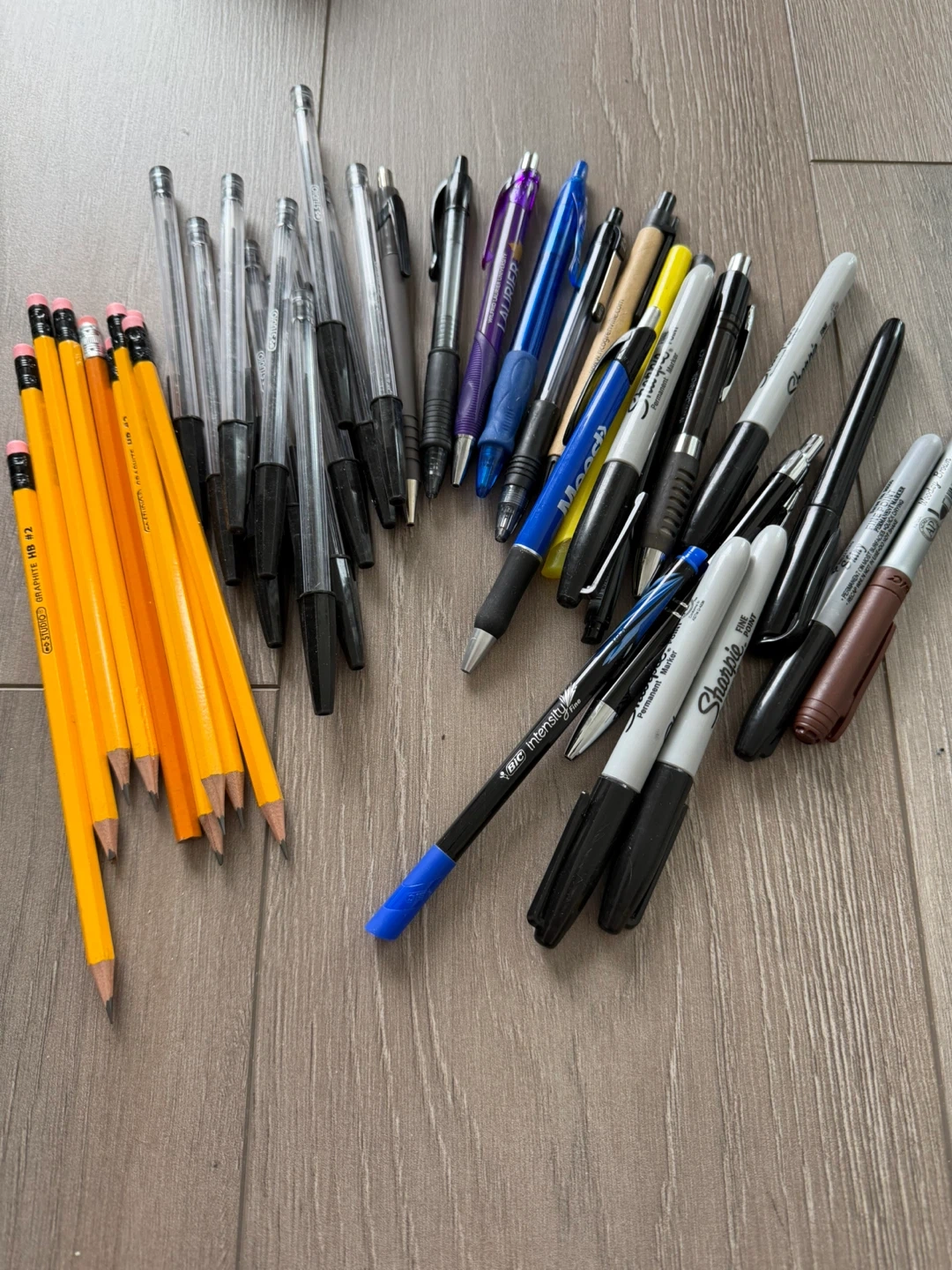 This is a collection of assorted writing utensils. It includes HB #2 pencils and various pens with different ink colours. There are also Sharpie permanent markers for various uses.