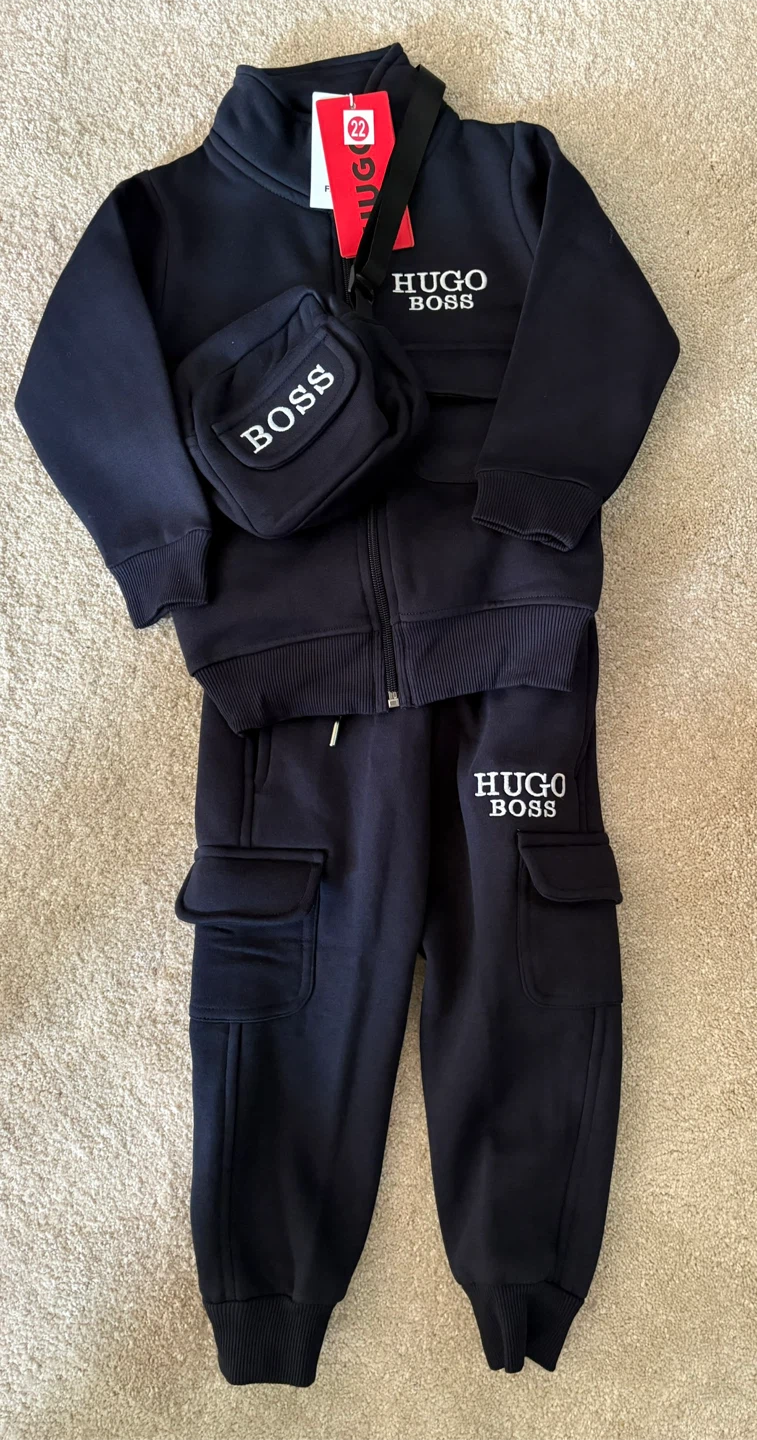 Hugo Boss kids tracksuit with a matching bag. Available in navy, red, and green. Perfect for your little one! Size 1-4 yrs