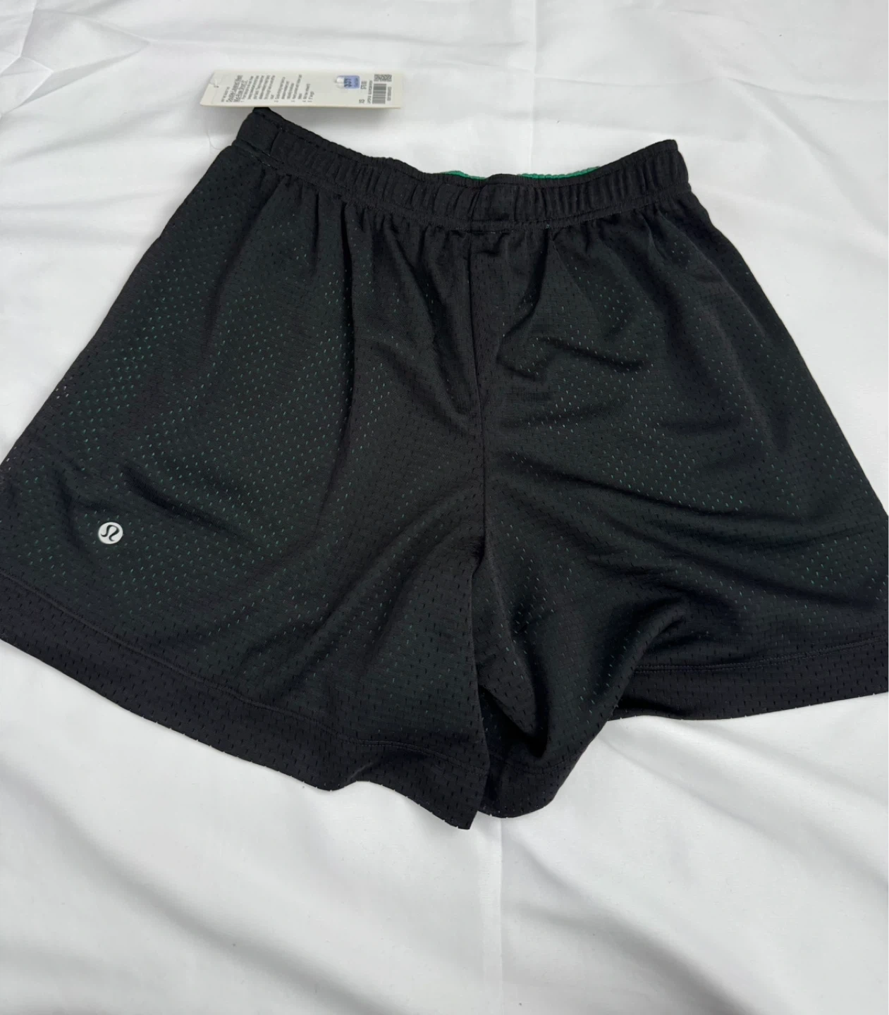 Lululemon "Double Layer Mesh" shorts in black with green accents. Size XS. Features a double-layer mesh construction for breathability.