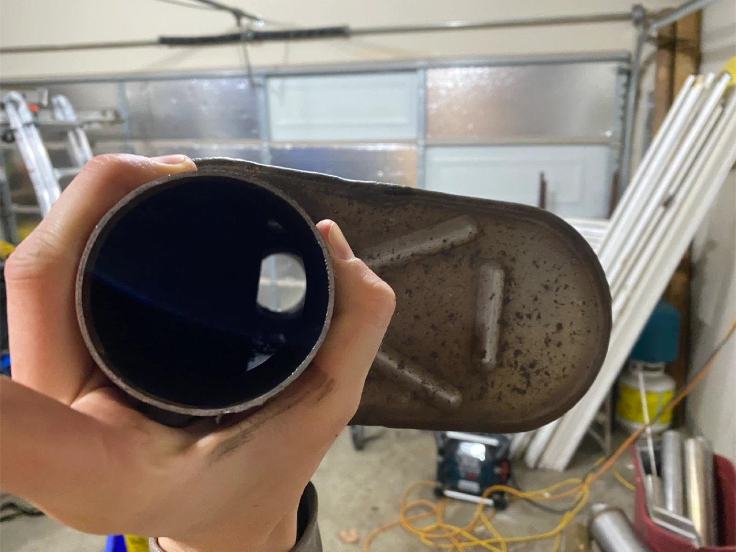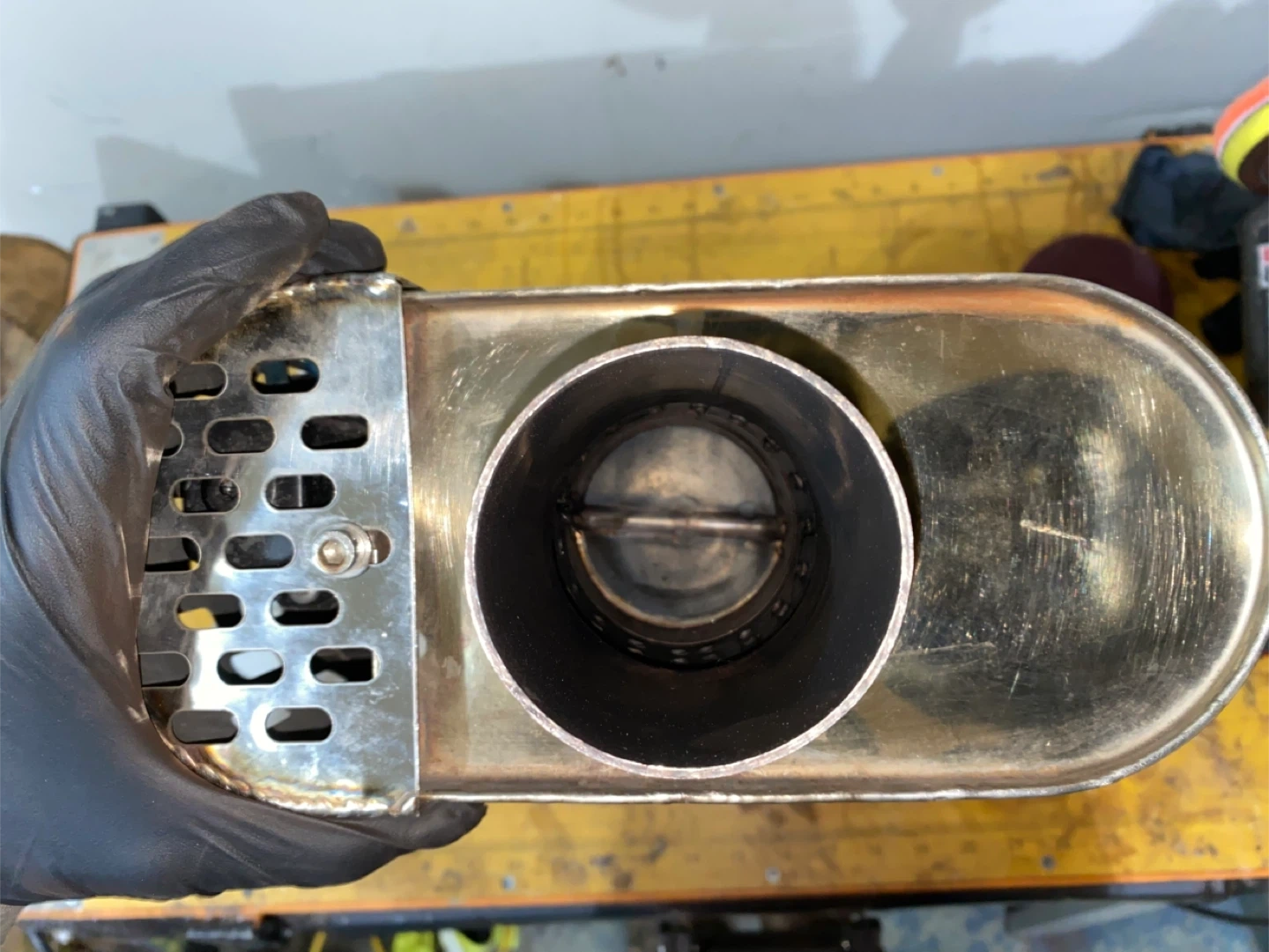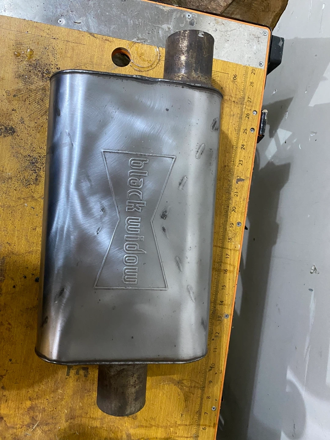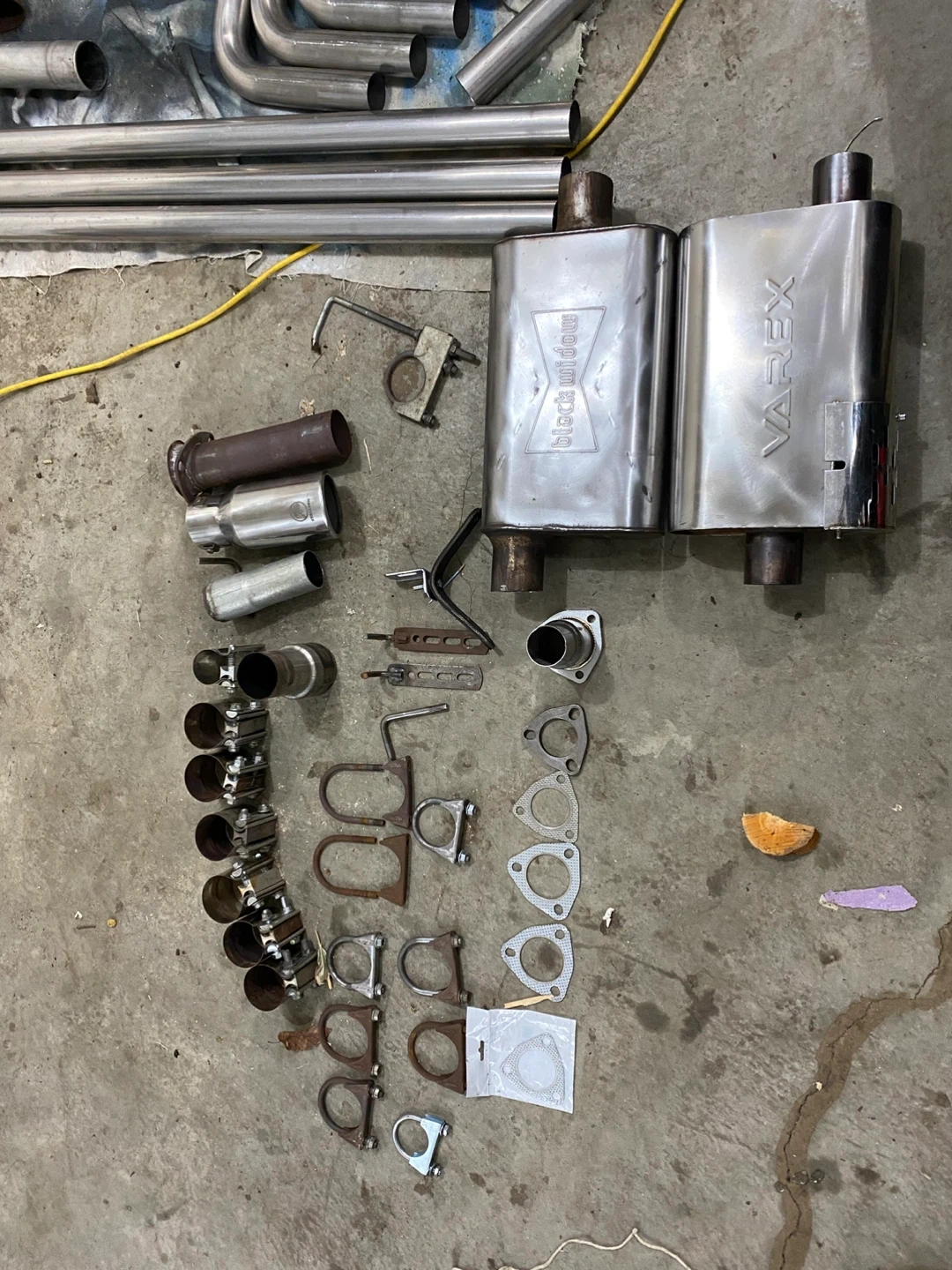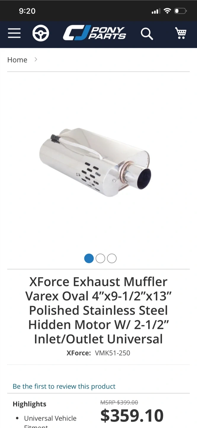 XForce Varex Oval 4"x9"x13" polished stainless steel hidden motor muffler. It has a 2-1/2" inlet/outlet, making it universal. The muffler comes with a switch that is wired your car battery, it is not remote control it is on a rocker switch all comes in the package. 2 1/2 exhaust pipe most of it has surface rust I also have 2 inch exhaust tubing witch is in perfect condition just didn’t need all of it. Lots of exhaust flanges and caskets. There are clamps mostly 2 1/2 and hangers. There is one exhaust tip that fits 2 inch to 2 1/2inch inlet it is also resonated. The muffler sounds great together but upgrading to a 3 inch exhaust system.