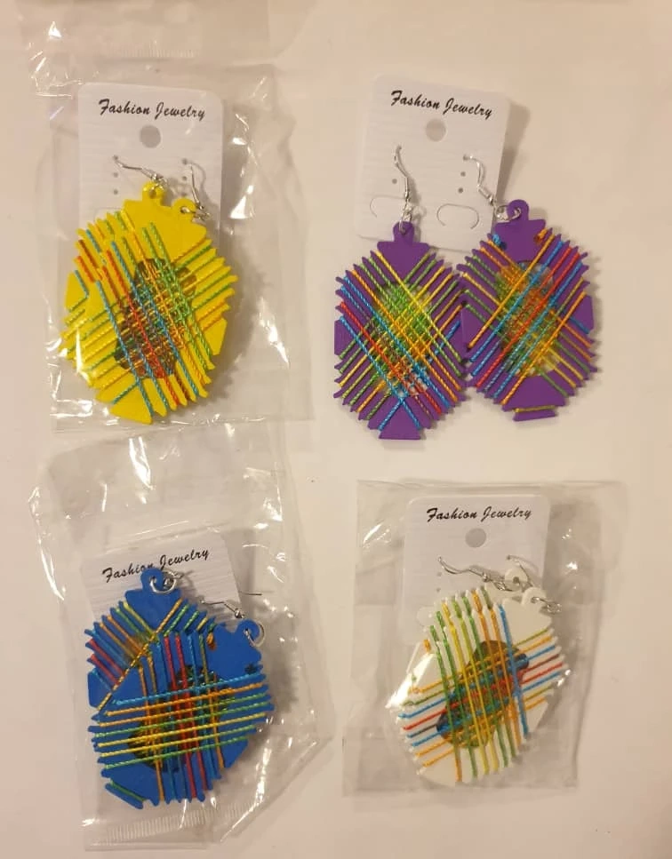 Set of earrings, with each pair featuring a different coloured base: yellow, purple, blue, and white. Each earring has a cross-stitch pattern. Extra light.