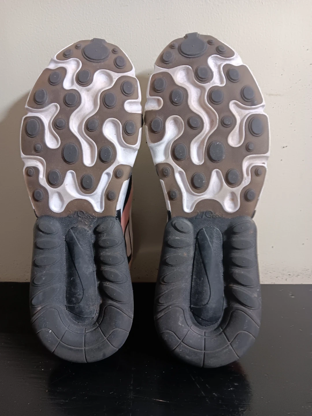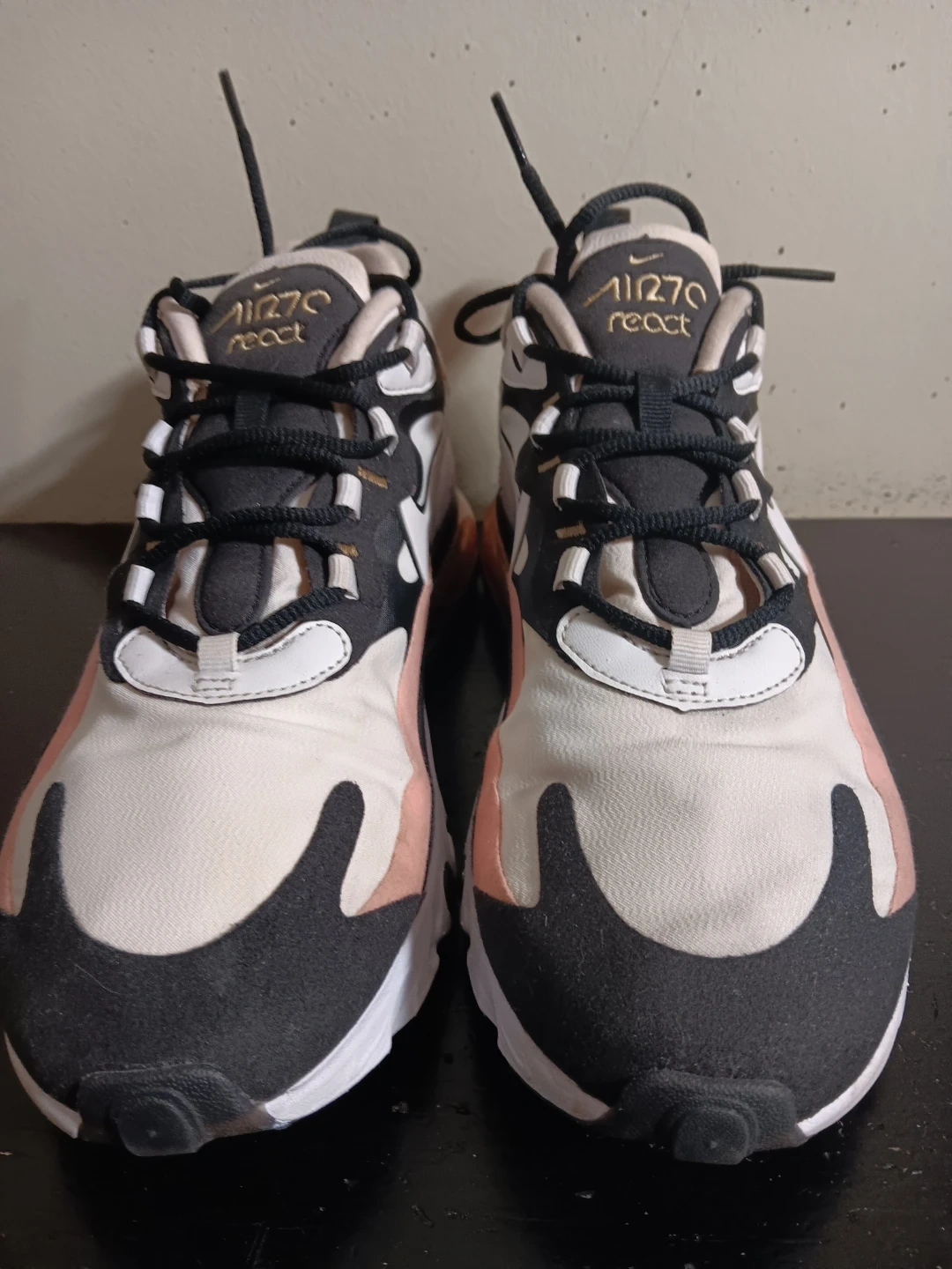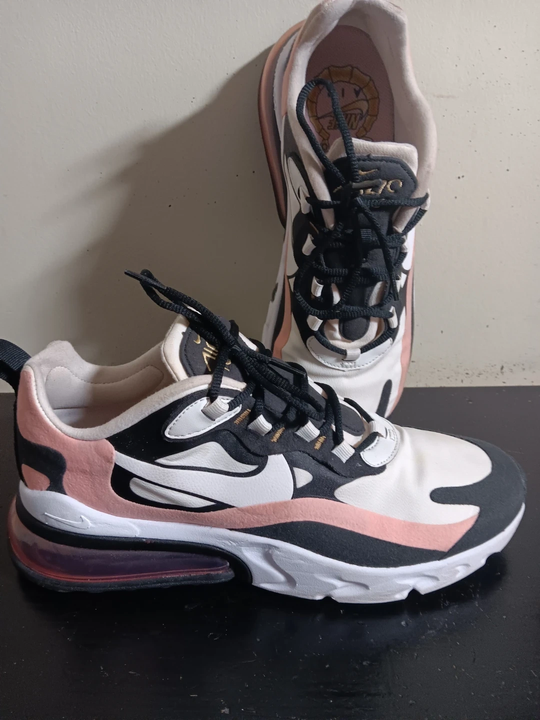 White, black, and pink Nike Air Max 270 React sneakers. It's a comfortable and stylish athletic shoe. These are great for everyday wear!