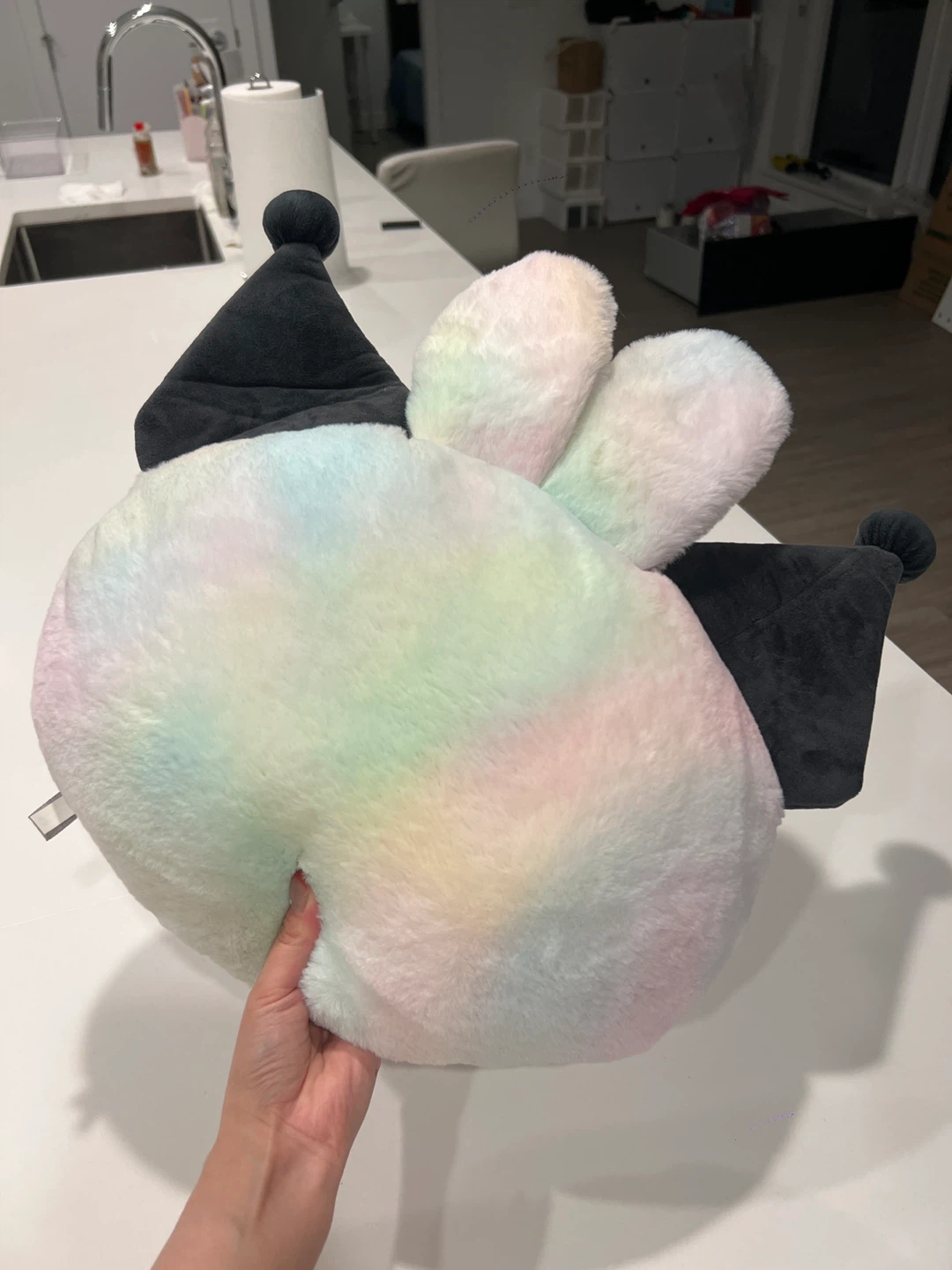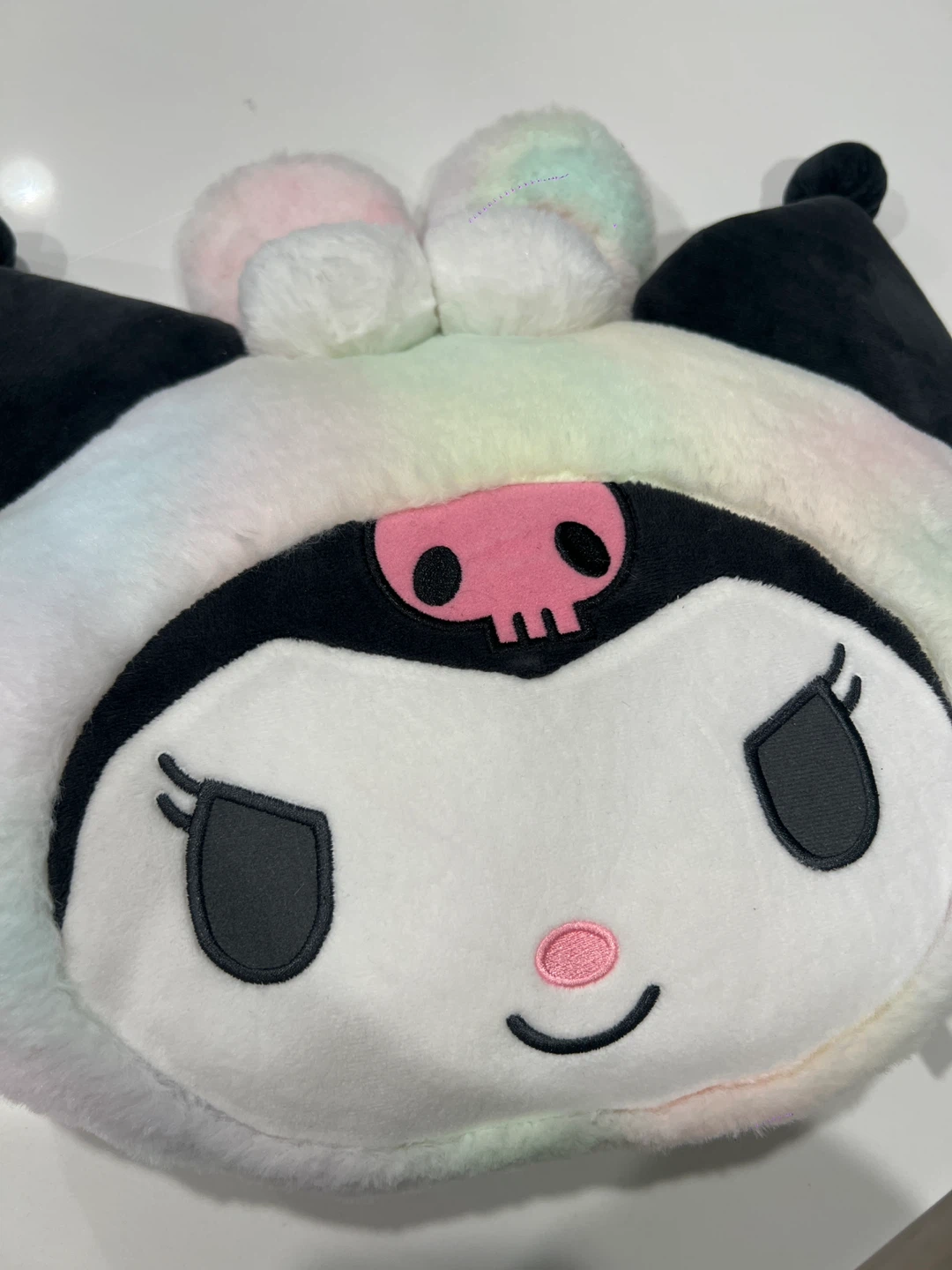 Selling a super cute Kuromi plush! It's in great condition and features a lovely pastel rainbow design. Perfect for Kuromi fans or anyone who loves kawaii plushies!
