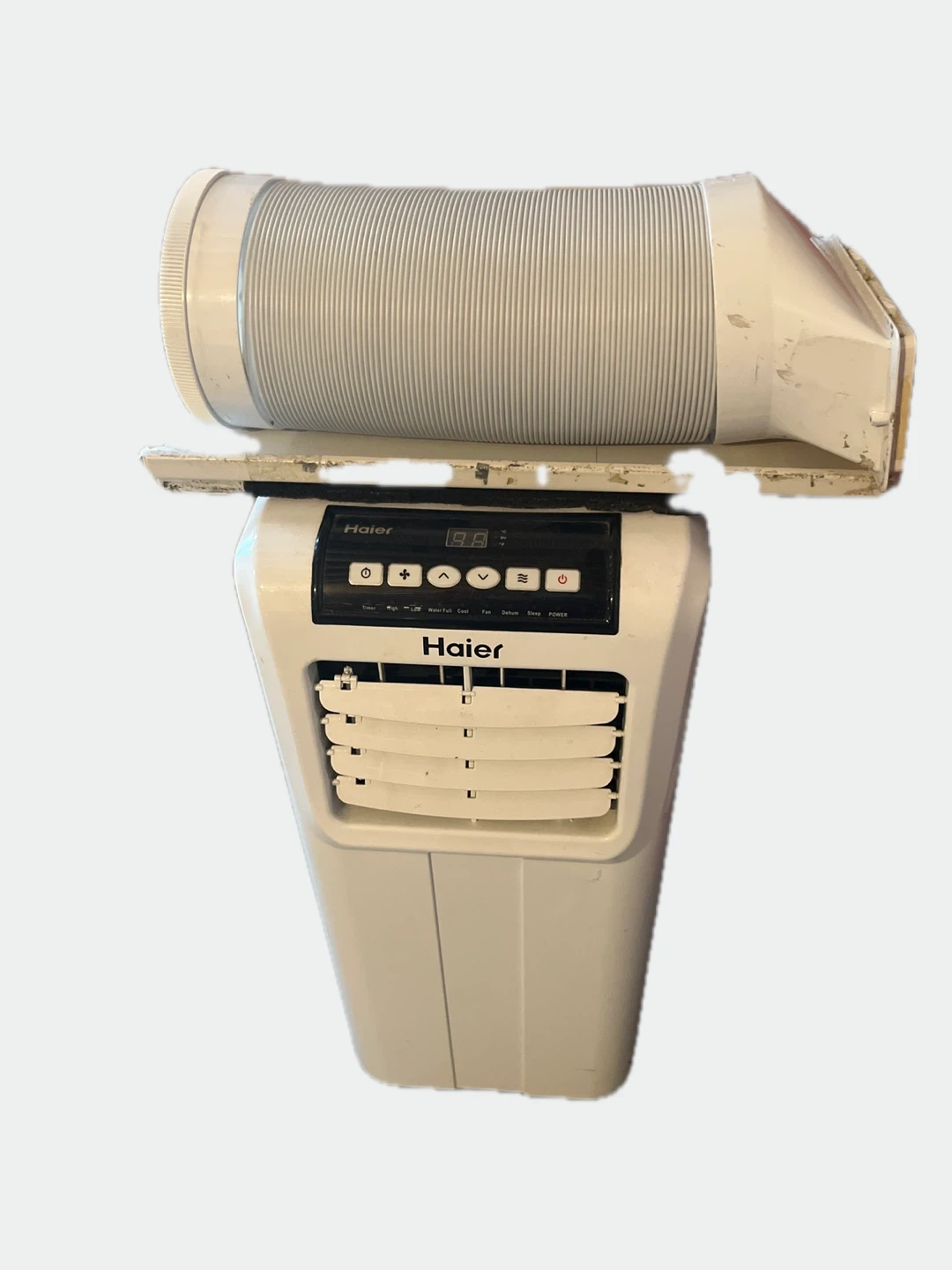 This is a white Haier portable air conditioner unit. It has a digital display and controls for fan speed, mode, and temperature. Includes an exhaust hose.