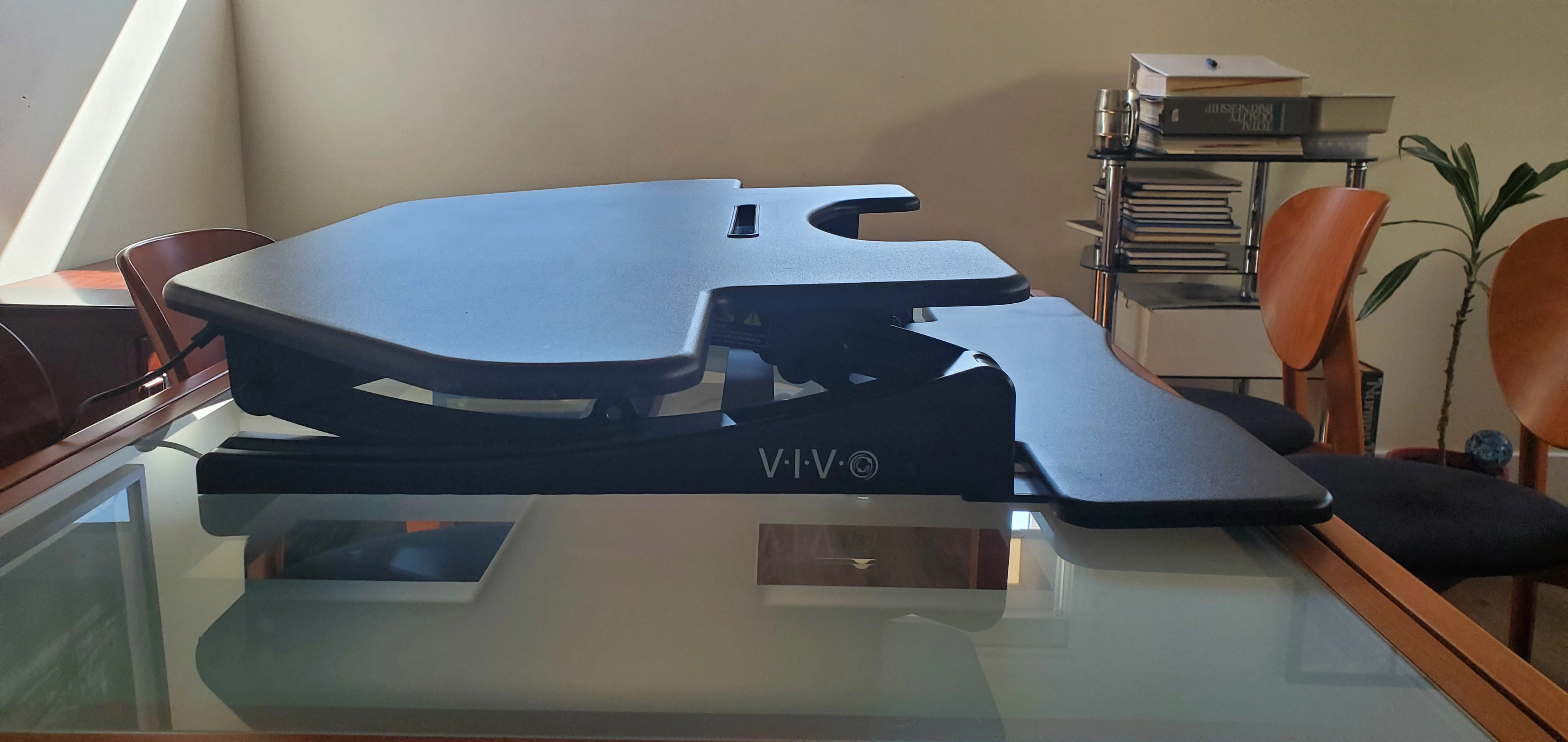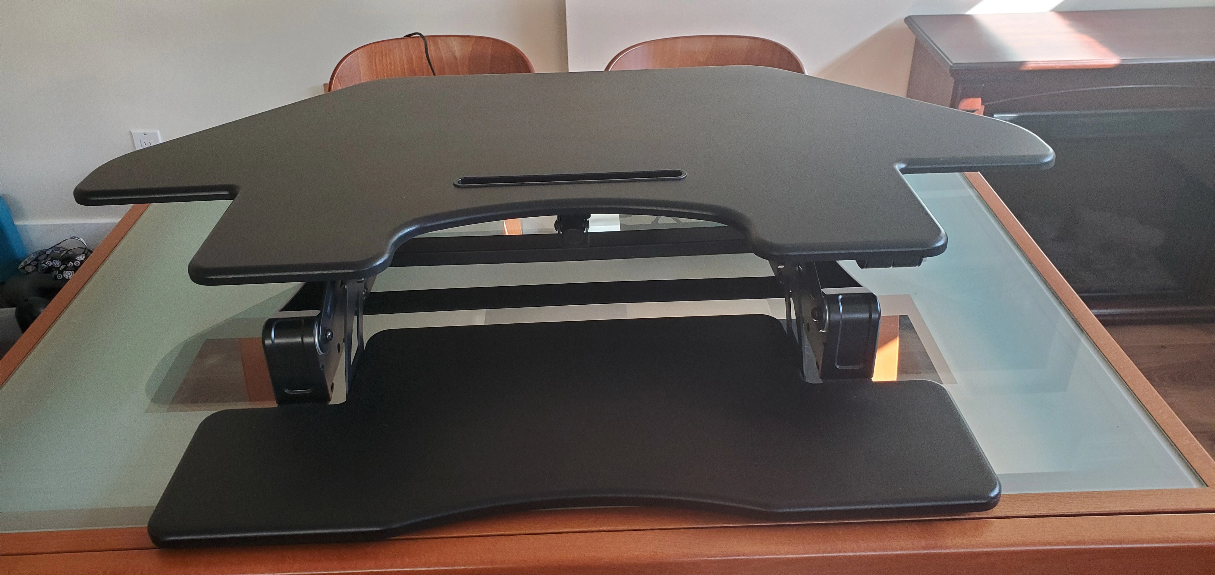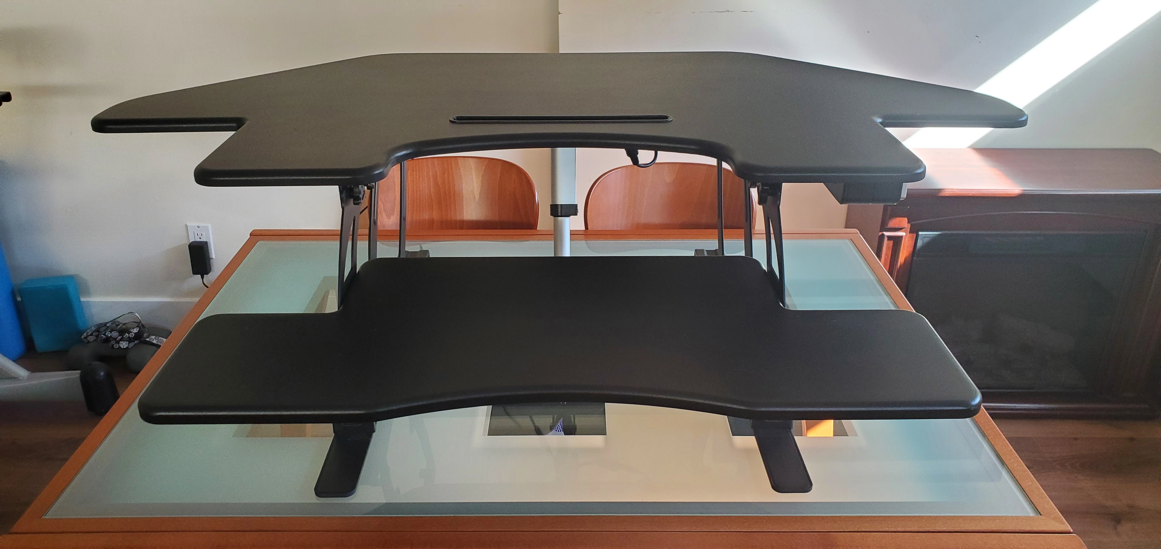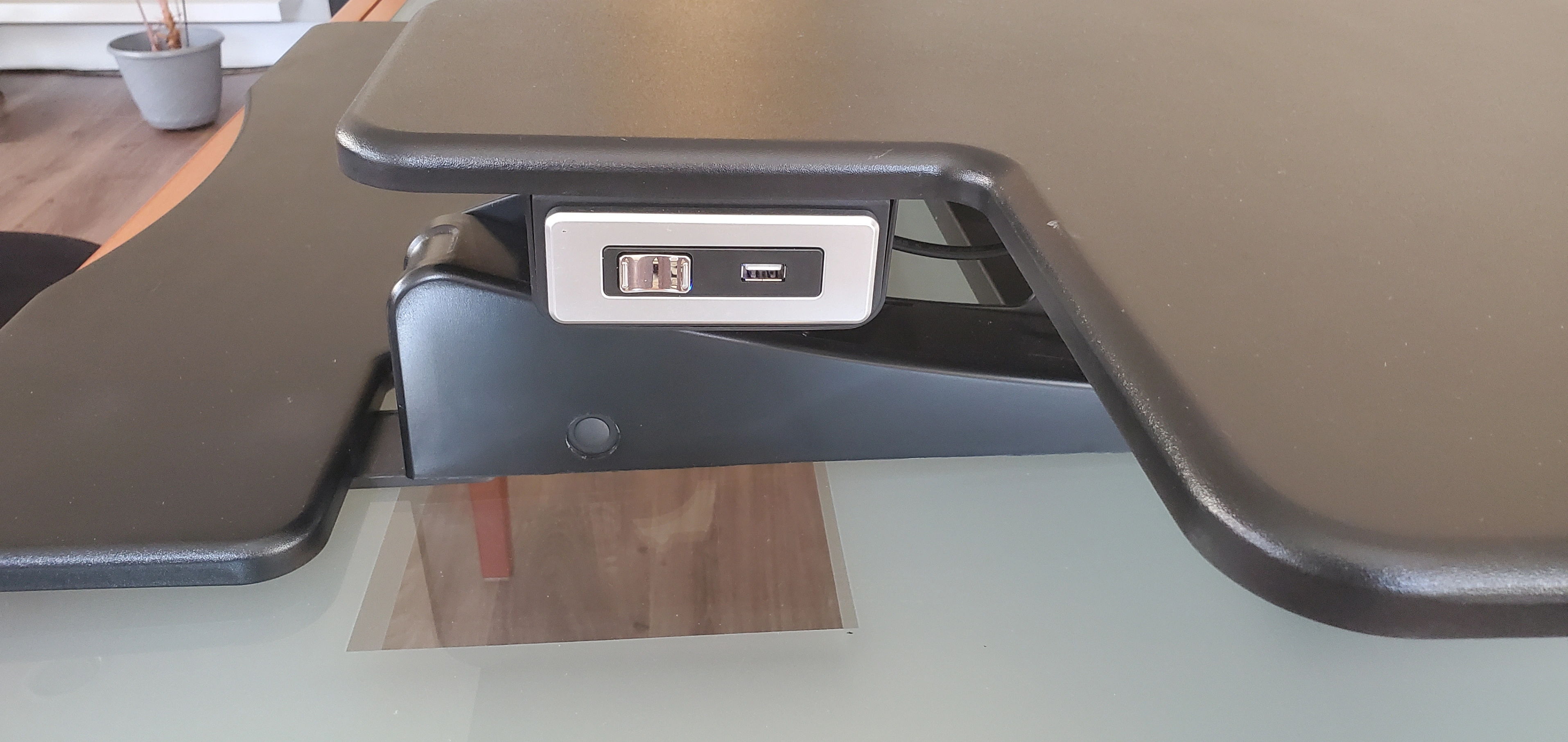 Corner electric stand up desk. Minimum height 6" above the desk it is placed on. Maximum height 16.5" above the desk it is placed on. Built in USB port beside the up/down button.