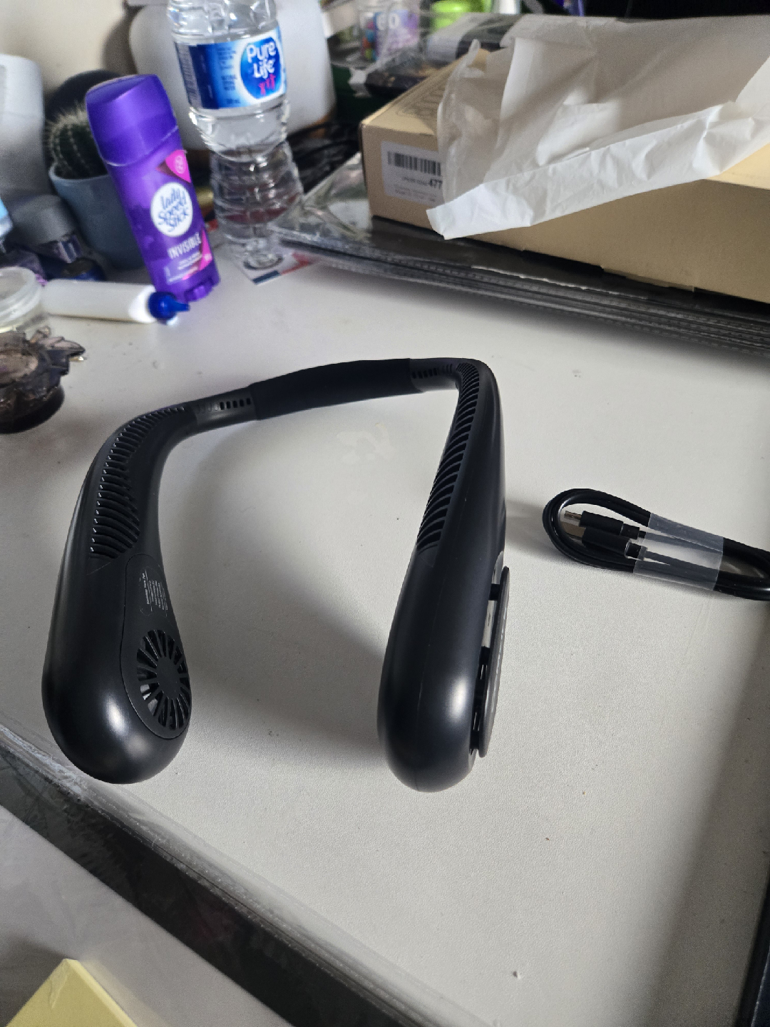 Stay cool on the go with this portable neck fan! It's perfect for those hot days when you need a little extra breeze. It comes with a charger so you can keep it powered up and ready to use