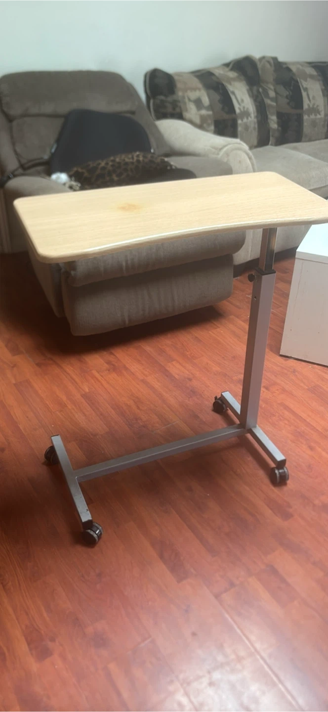This is an adjustable height rolling desk with a light wood-look tabletop. It's easy to move around on its casters. The height can be adjusted to suit your needs.