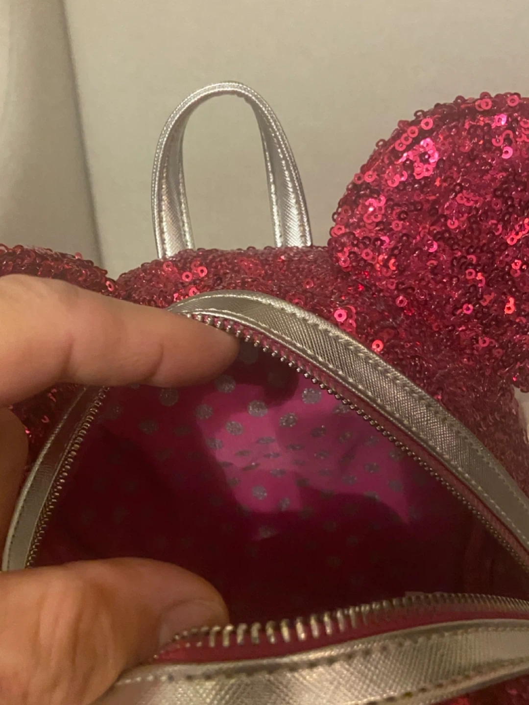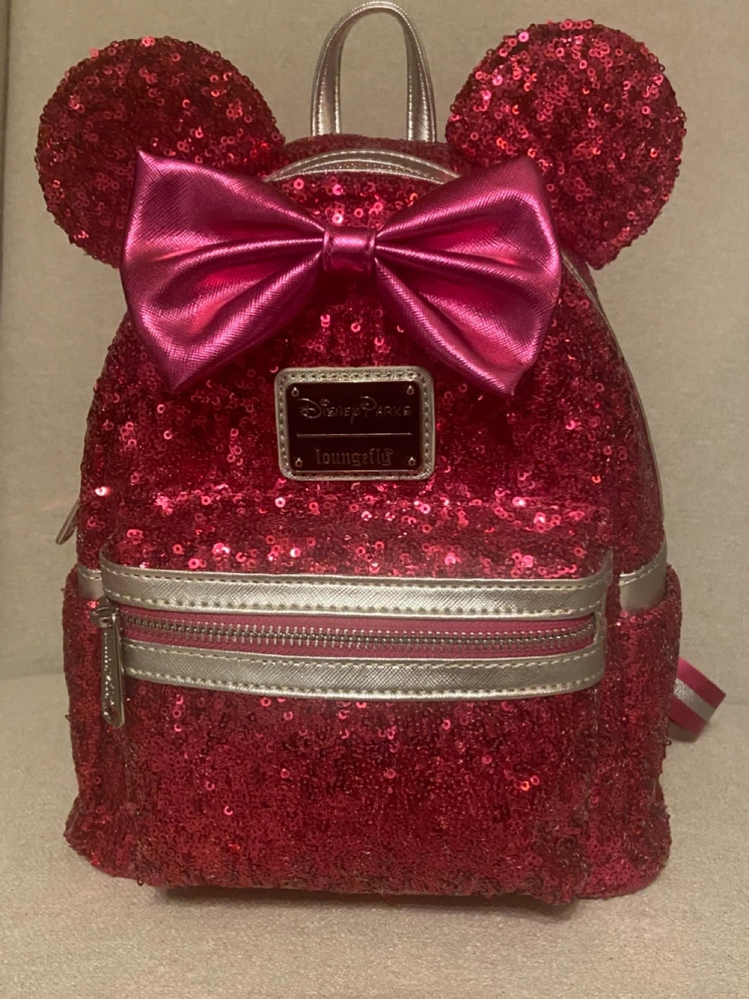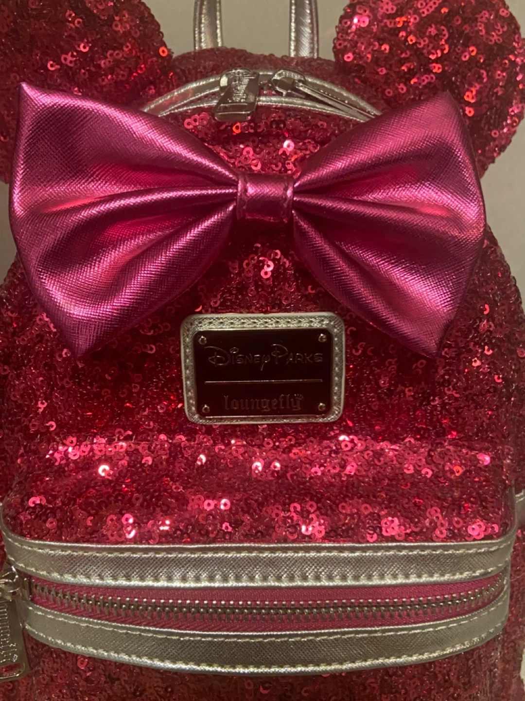 Only used twice. This dazzling pink sequin backpack features Minnie Mouse ears and a signature bow. It has adjustable straps for comfort and a zippered front pocket for essentials. The interior lining has a fun polka dot pattern. It's perfect for theme park visits or everyday adventures! The ears are technically child sized, but fit smaller adults fine.