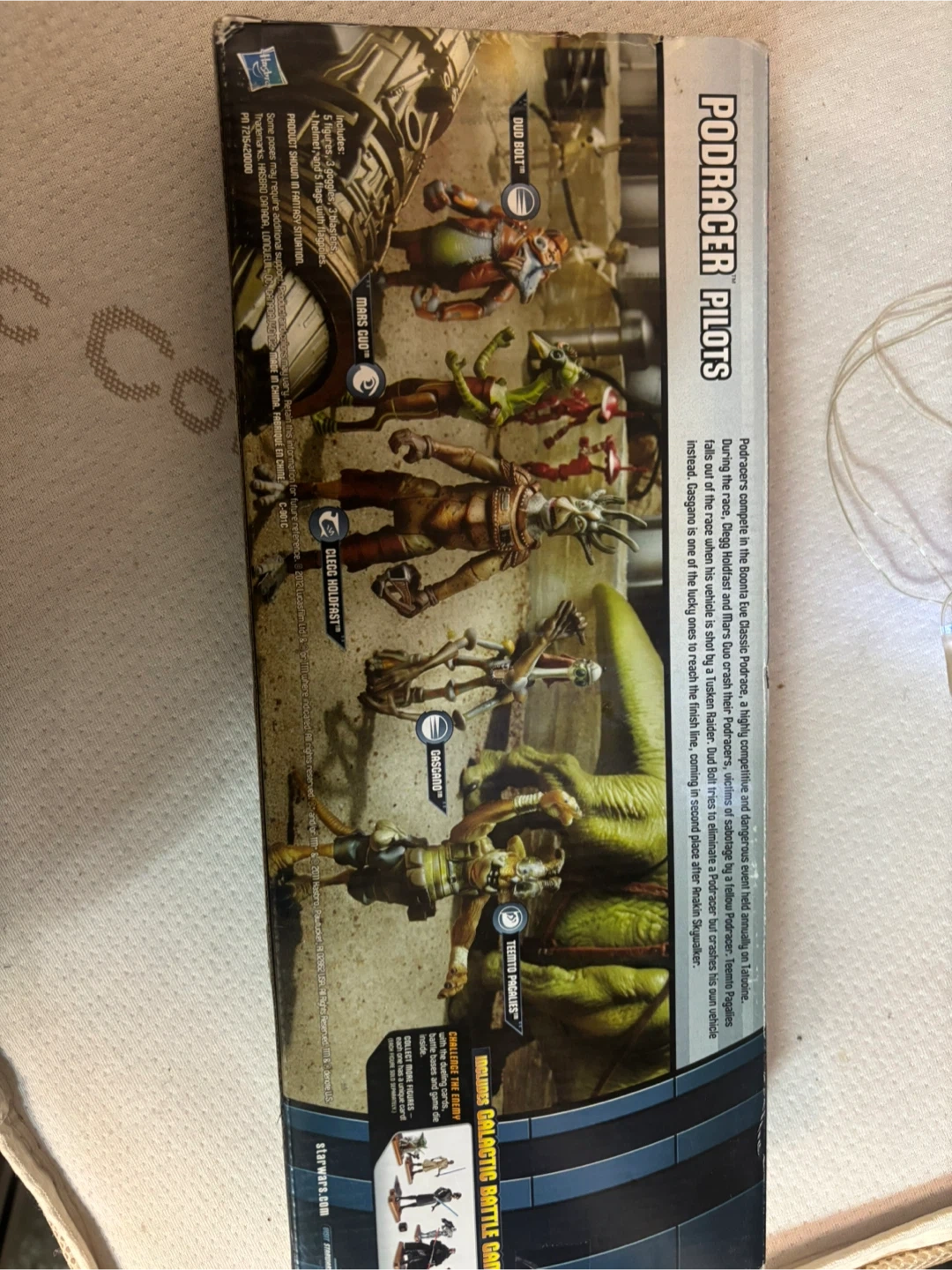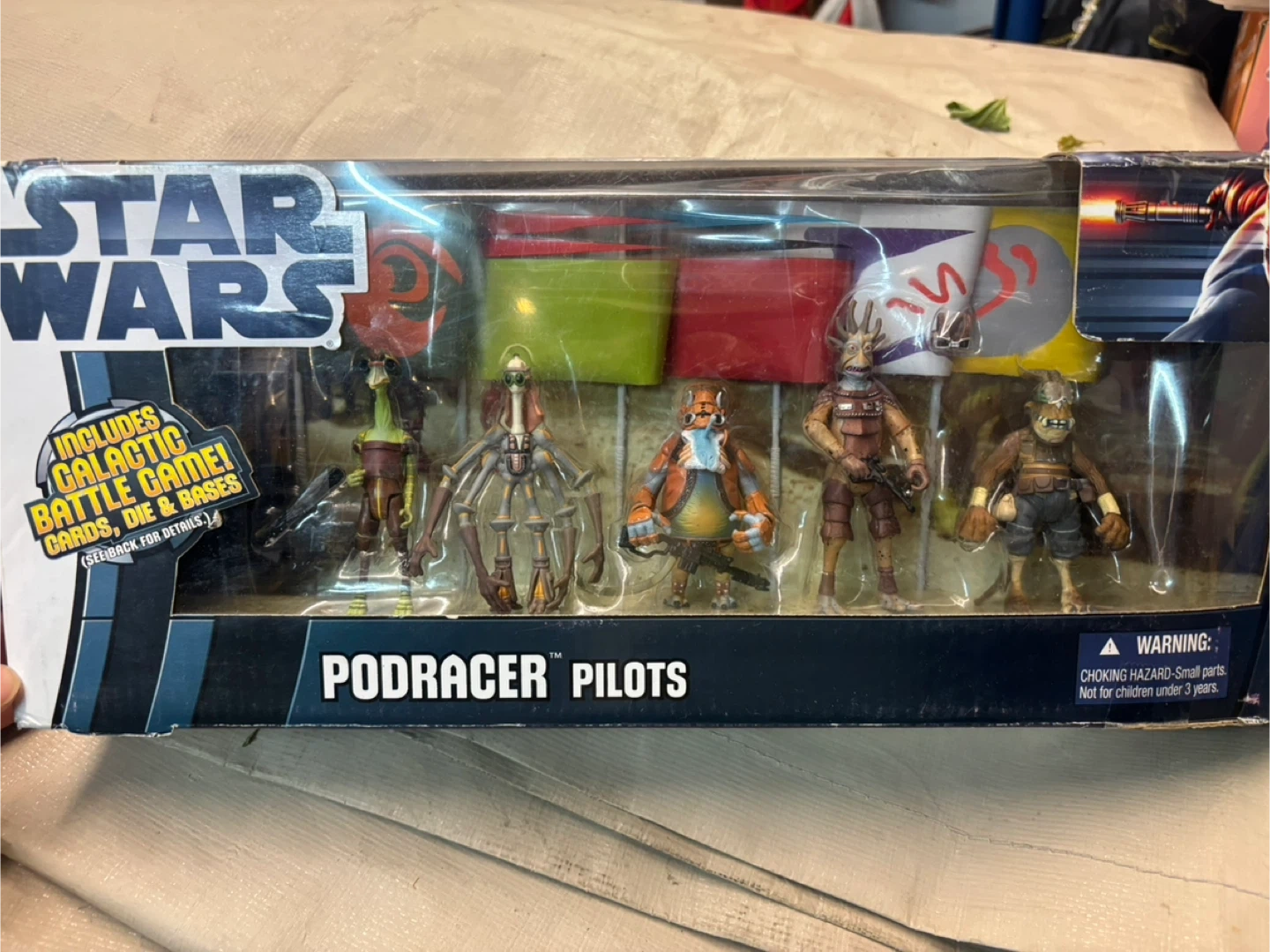 Includes 5 Star Wars Podracer Pilots action figures. Figures include Anakin Skywalker, Gasgano, Mars Guo, Teemto Pagalies, and Sebulba. Also includes a Galactic Battle Game cards, dice, and bases.