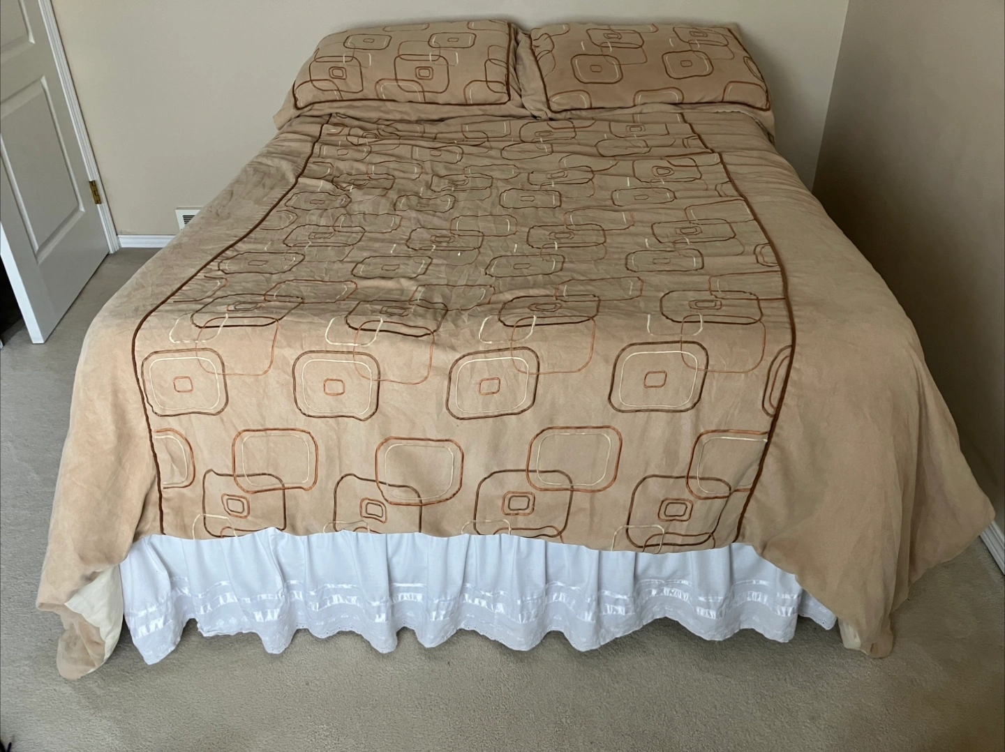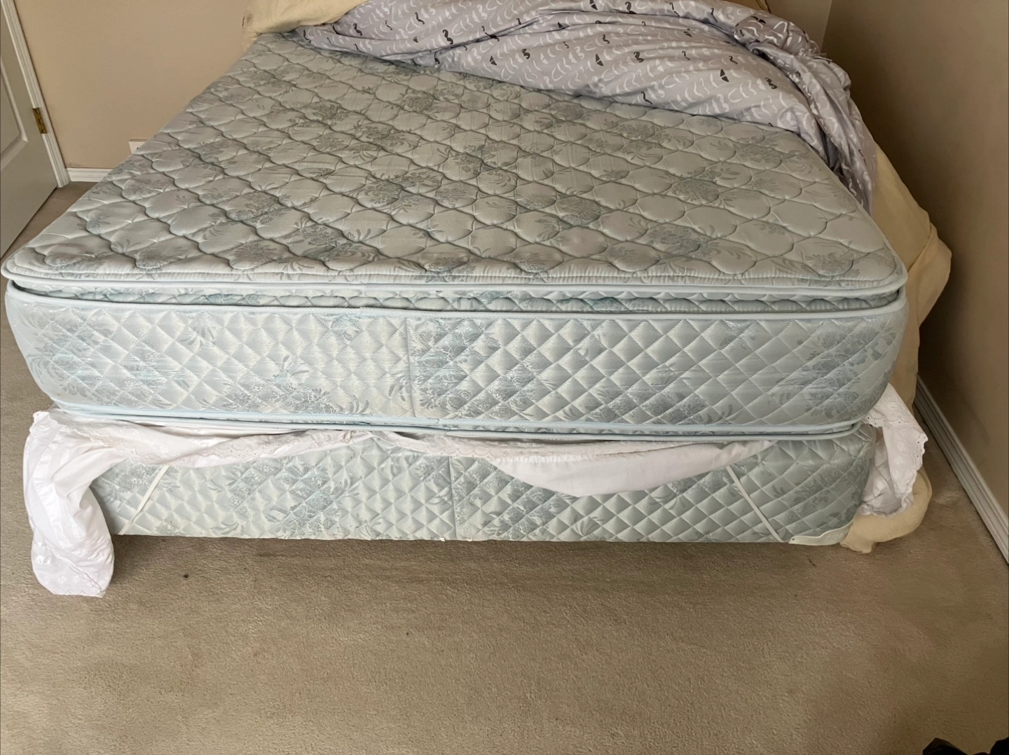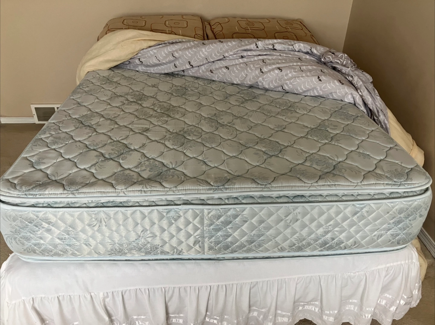 Double (full) size mattress set. It's all clean and in very good condition. It includes a mattress, spring box, skirt, comforter, sheets, pillows and two pillow shams. The colours are neutral and would fit well in any bedroom!