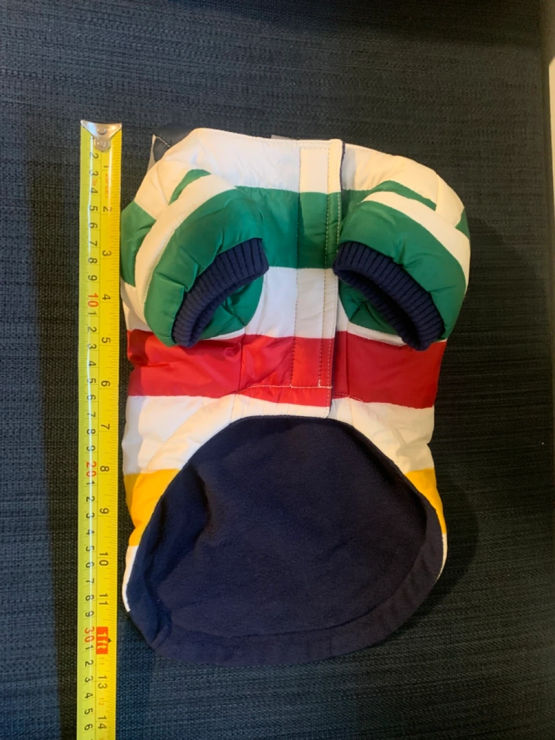 Selling a Stripes HBC dog coat in size XS. It's in great condition and ready for your furry friend to stay warm and stylish! Measurements shown in photos