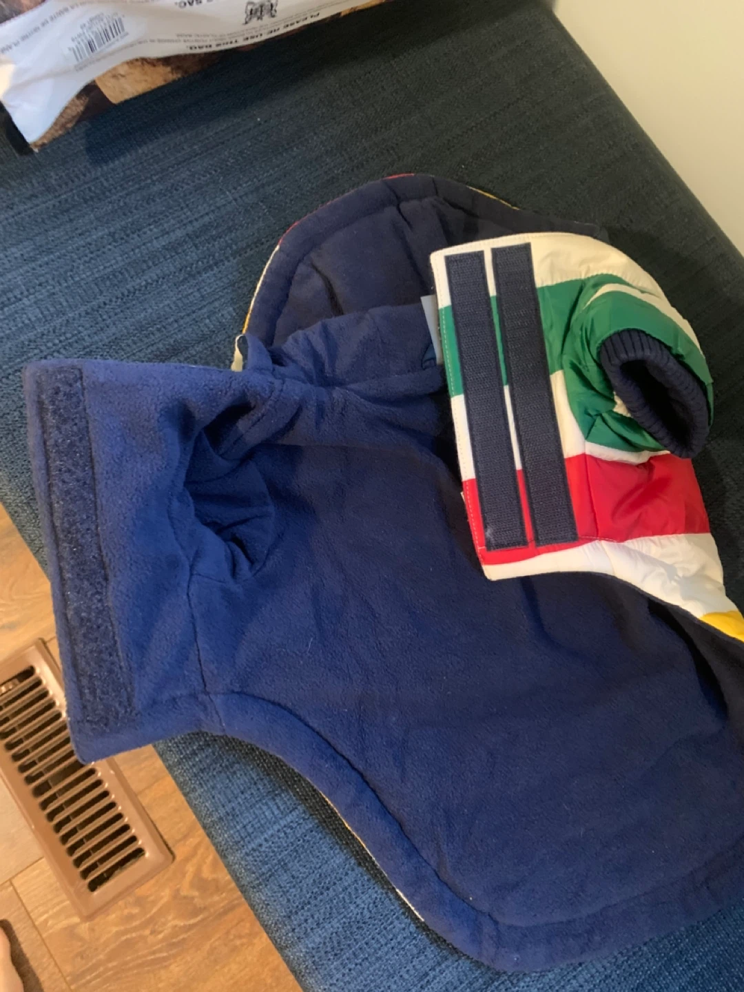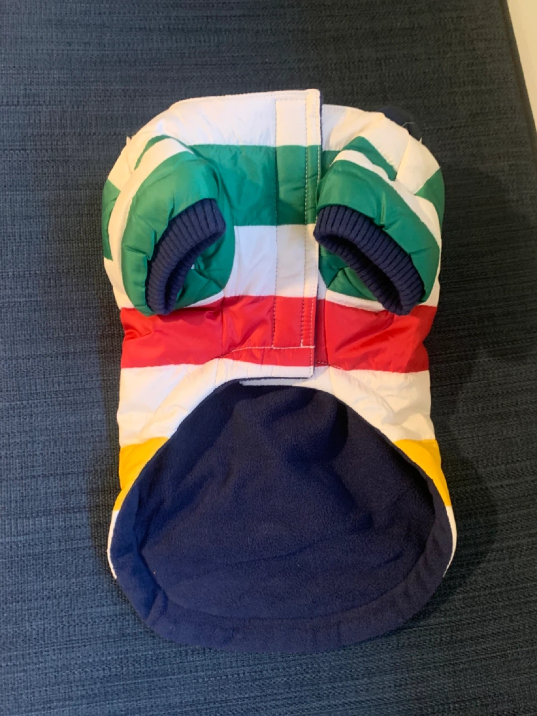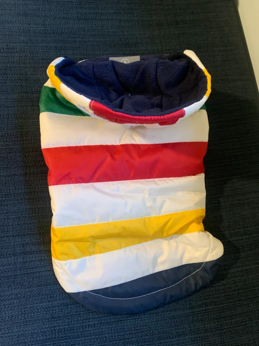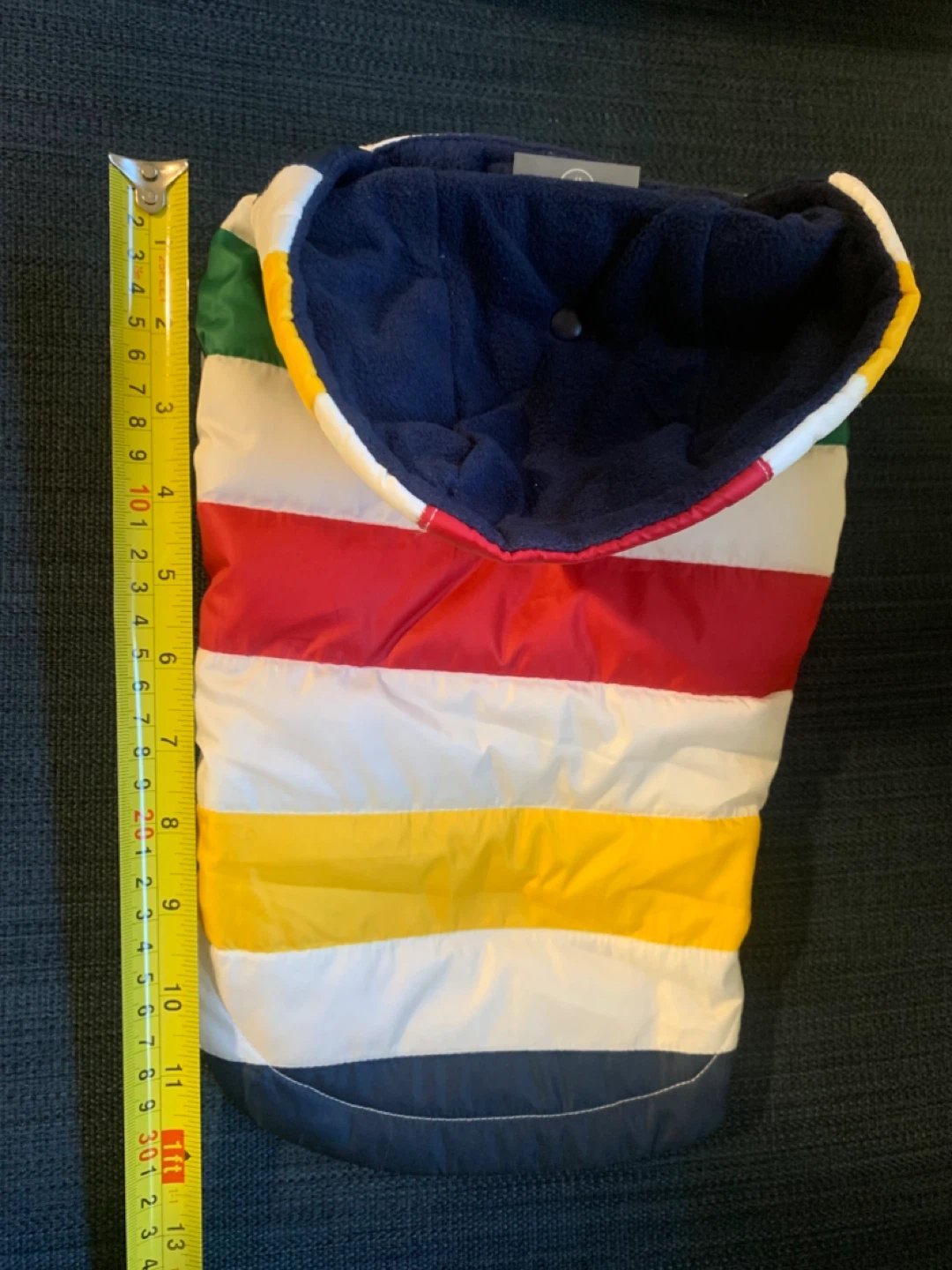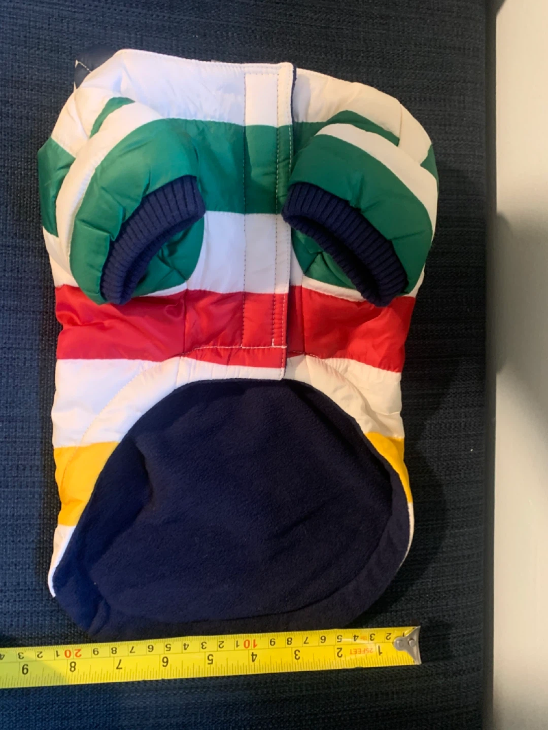 Selling a Stripes HBC dog coat in size XS. It's in great condition and ready for your furry friend to stay warm and stylish! Measurements shown in photos