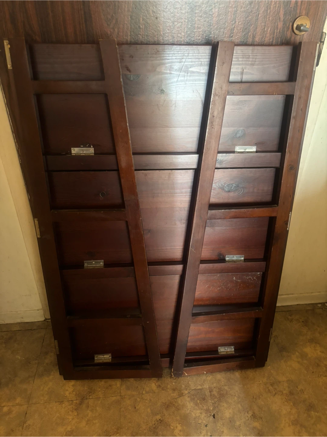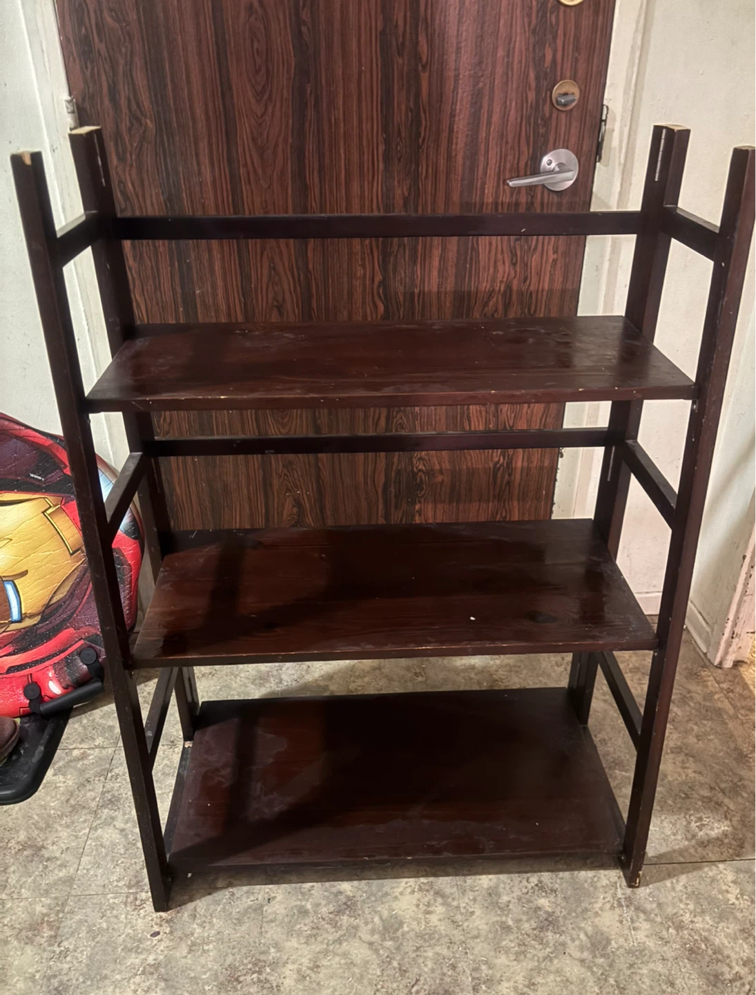 This is a dark brown, 3-tier folding shelf unit. It's made of wood and folds for easy storage. It has three shelves for displaying items. Or use it for shoes π