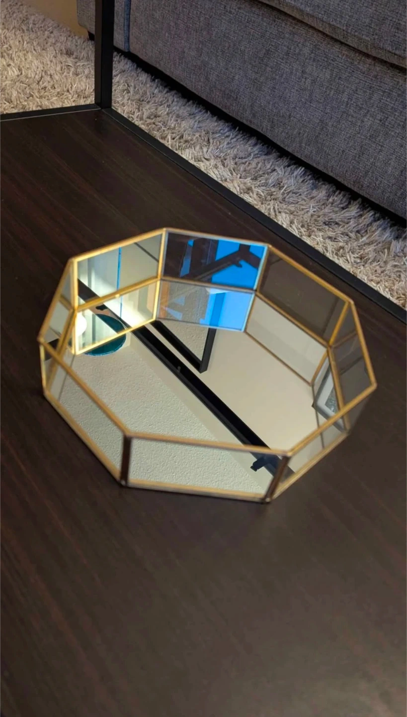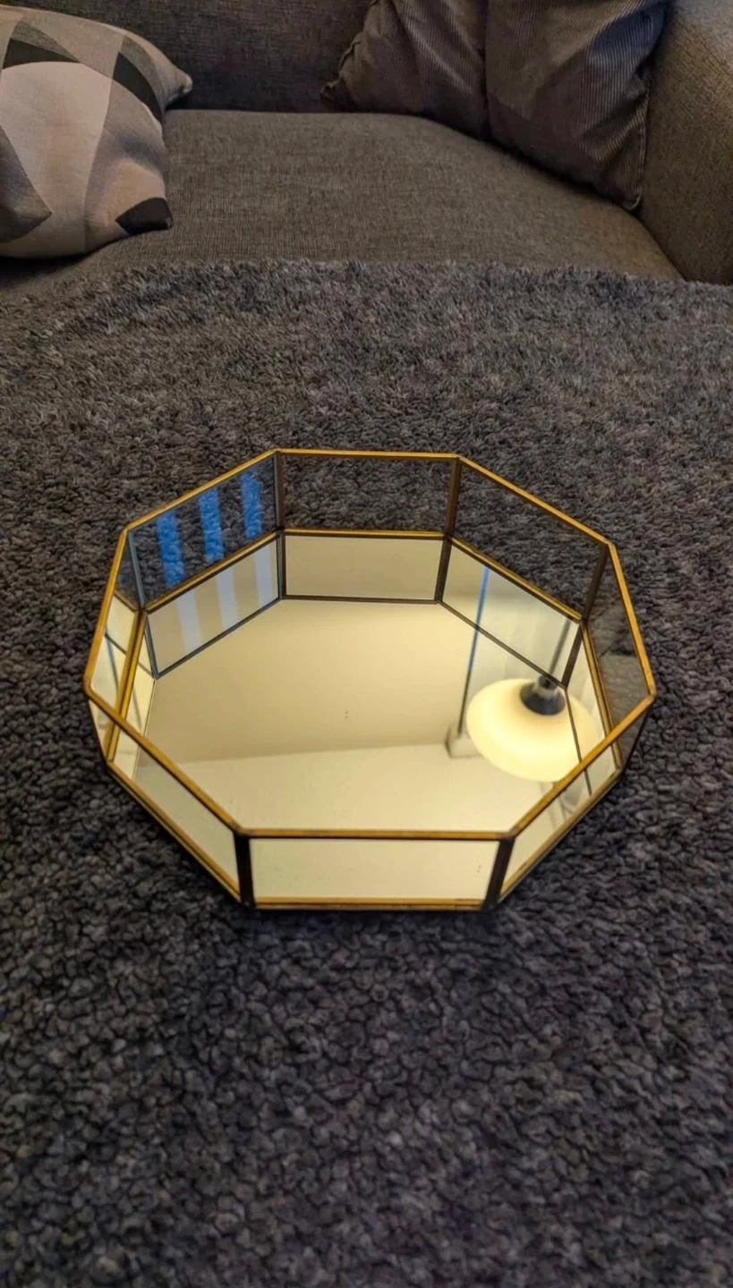 A decorative octagonal tray featuring a mirrored surface and gold-toned metal trim. It's perfect for displaying small items like jewellery or perfumes. Measures approximately 9 inches in diameter.