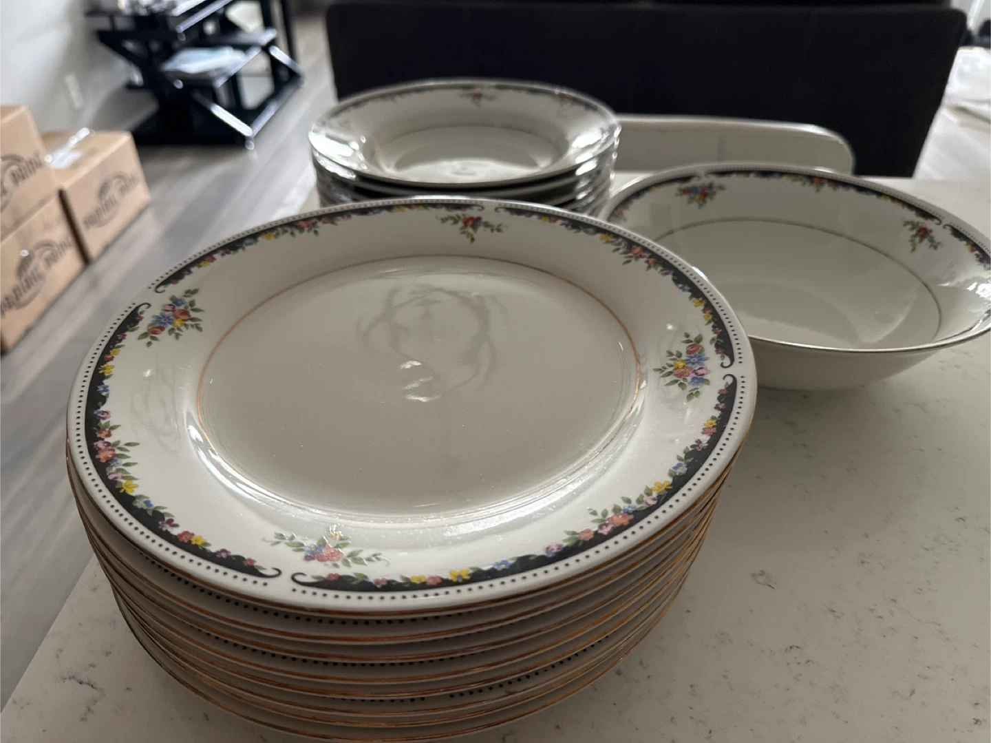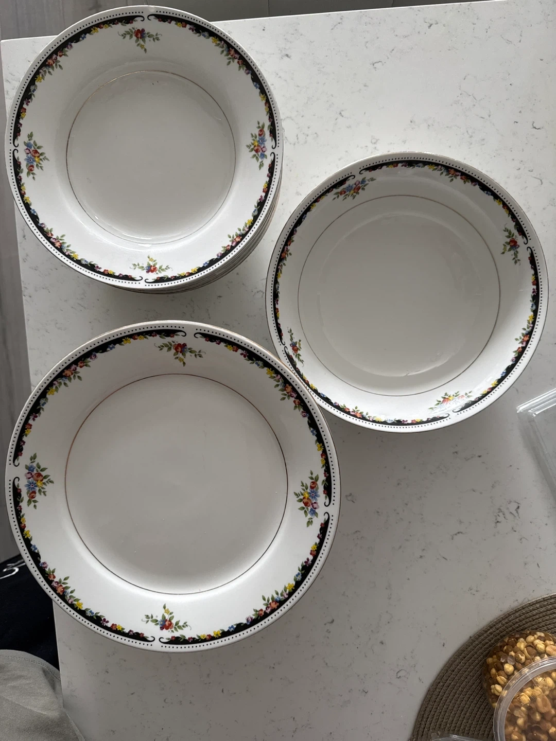 This is a set of 8 big, 7 small plates and 1 serving bowl white featuring a decorative floral rim. The plates have a gold trim around the edge. They're made of ceramic. This set would be great for hosting dinners or special occasions!