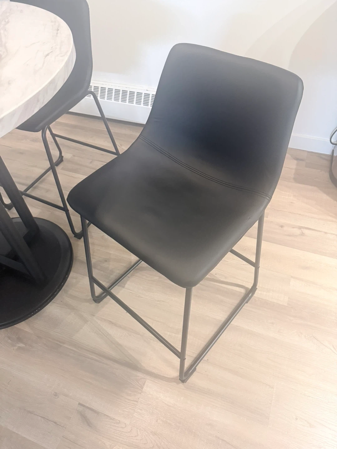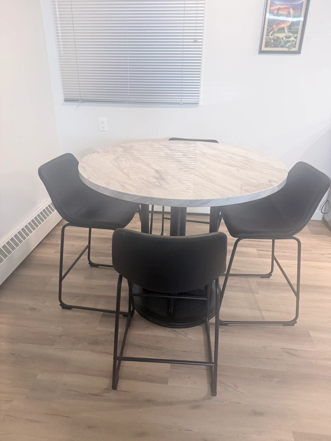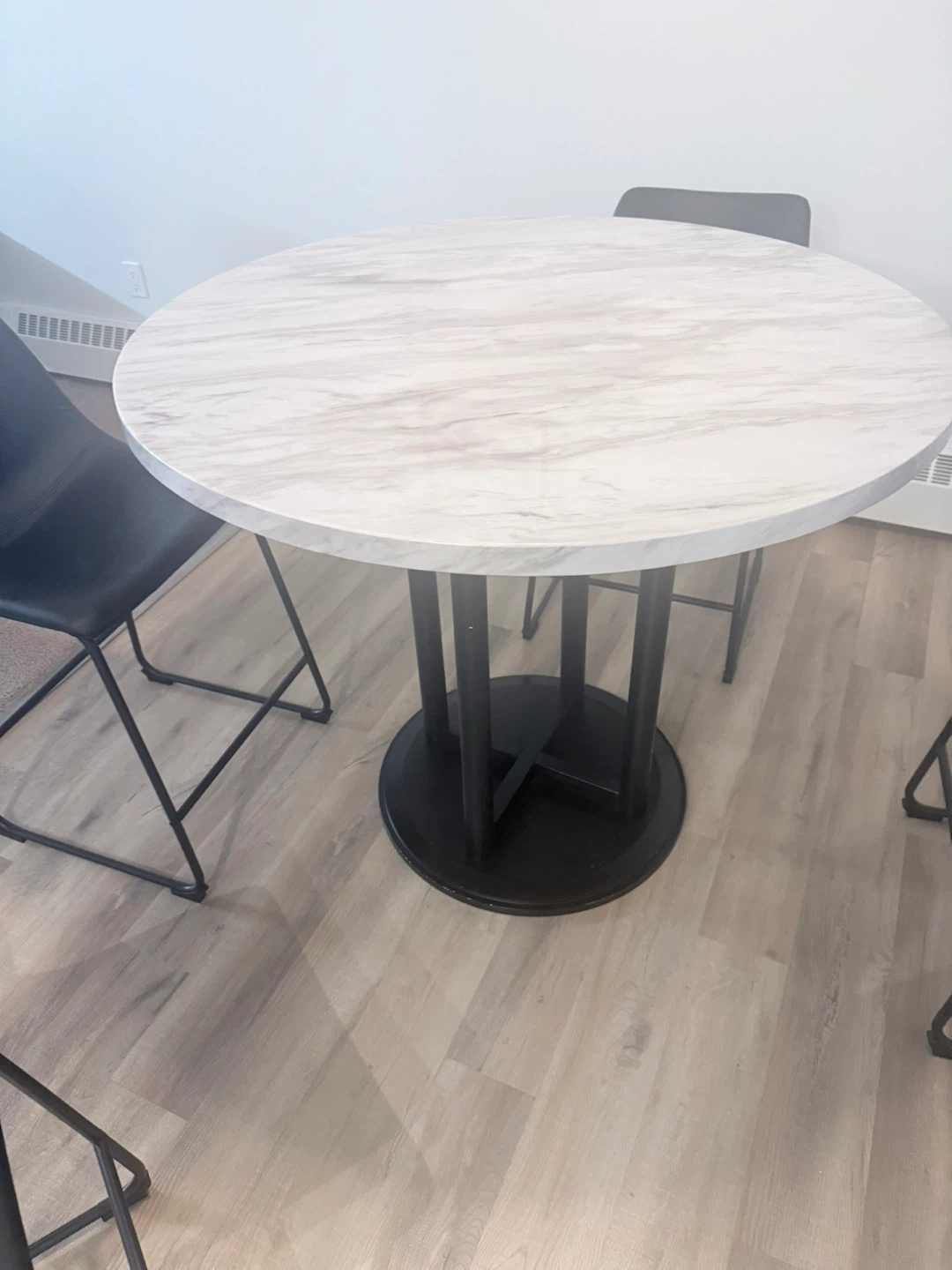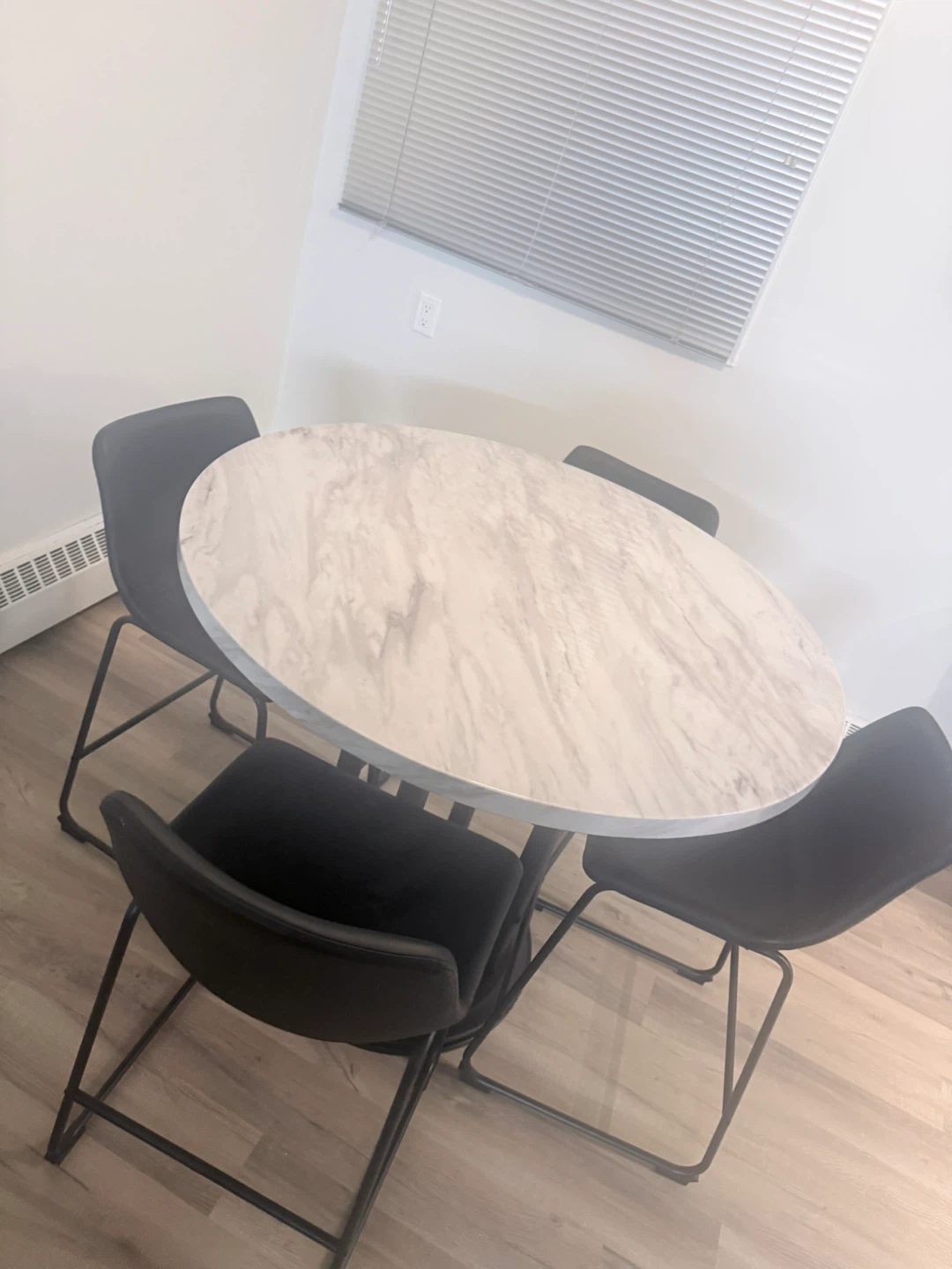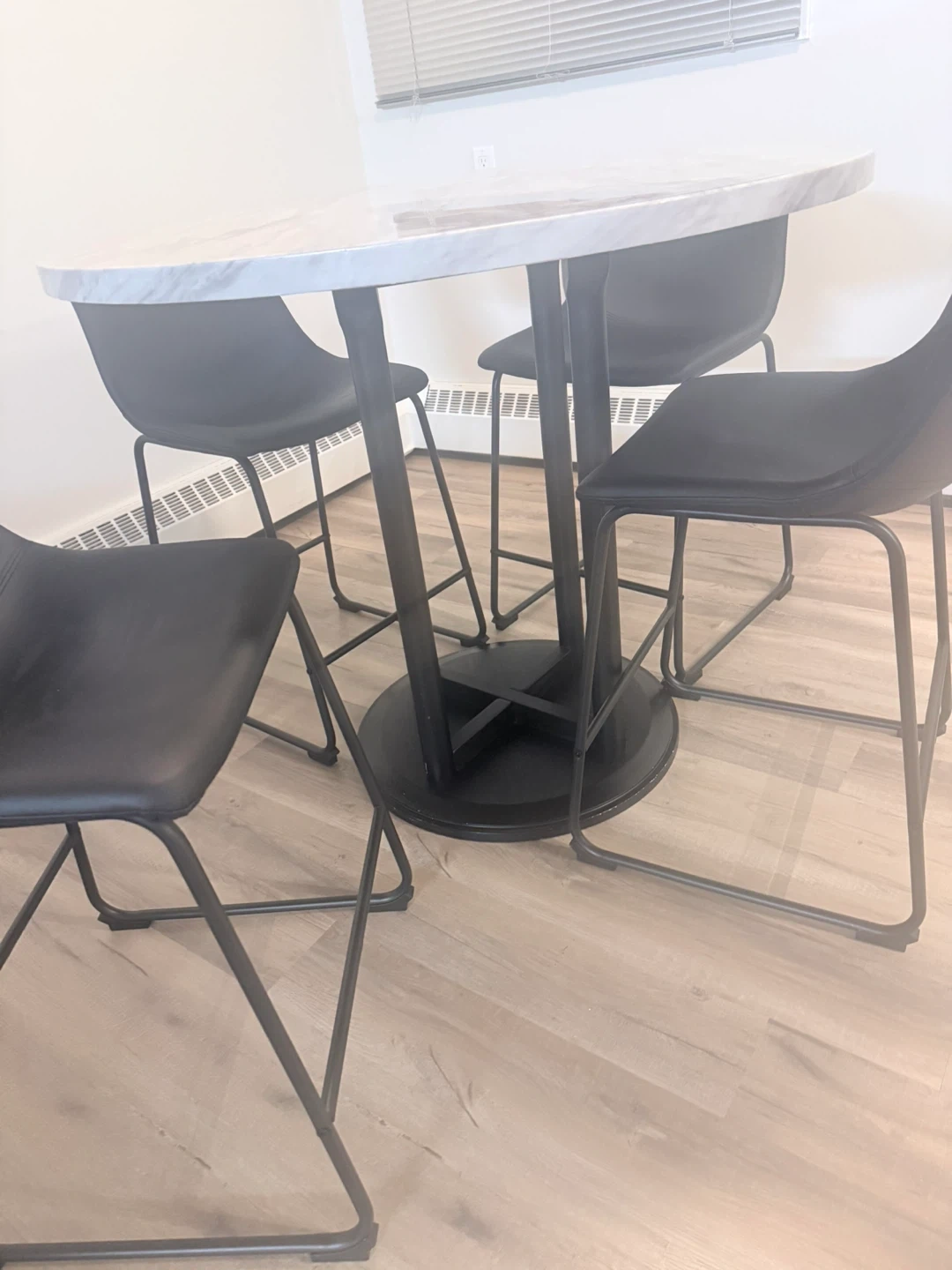 Round marble-look dining table with a black pedestal base. Comes with four black faux leather chairs with black metal legs. It's a great setup for smaller dining spaces. Chairs are comfortable and stylish. Table is approximately 36 inches in diameter.