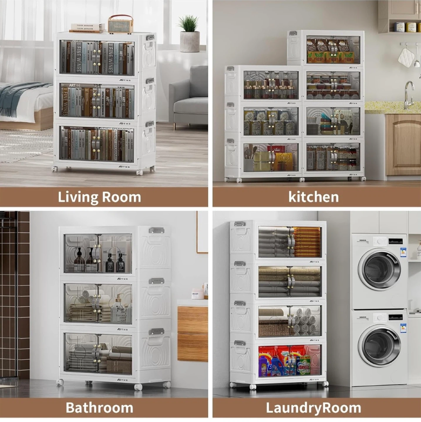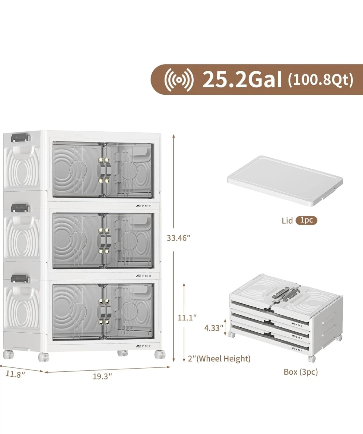 This is a white storage box with 4 drawers and 4 universal wheels for easy movement. It has a capacity of 25.2 gallons. The dimensions are 19.3" wide, 11.8" deep, and 33.46" high. It also includes a lid.