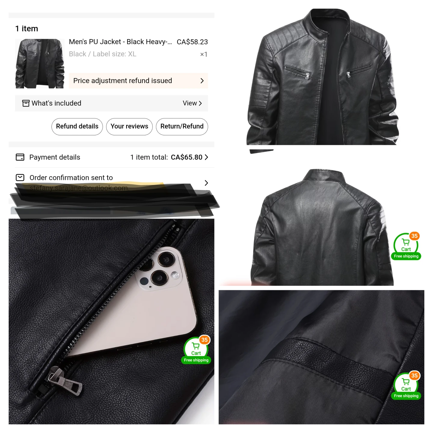 This is a men's black PU jacket. The jacket has a zipper closure and multiple zippered pockets.