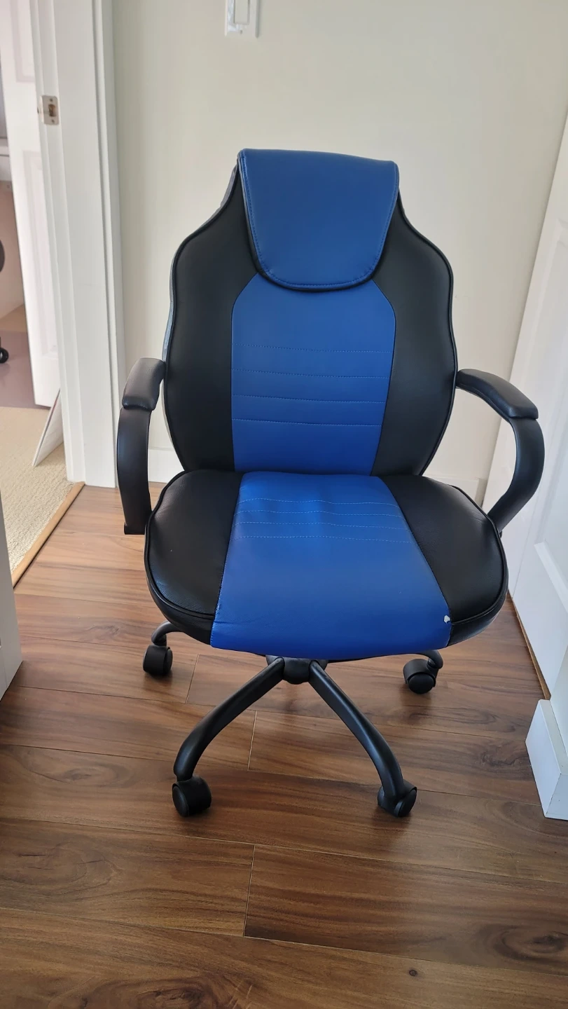 This ergonomic office chair features a black and blue colour scheme with stitched detailing. It's made of faux leather and has a swivel base with wheels. It's a comfortable chair for long hours of work or gaming.