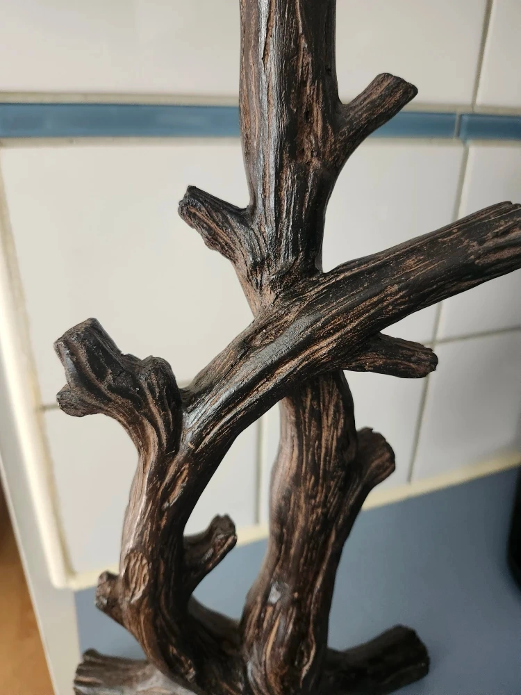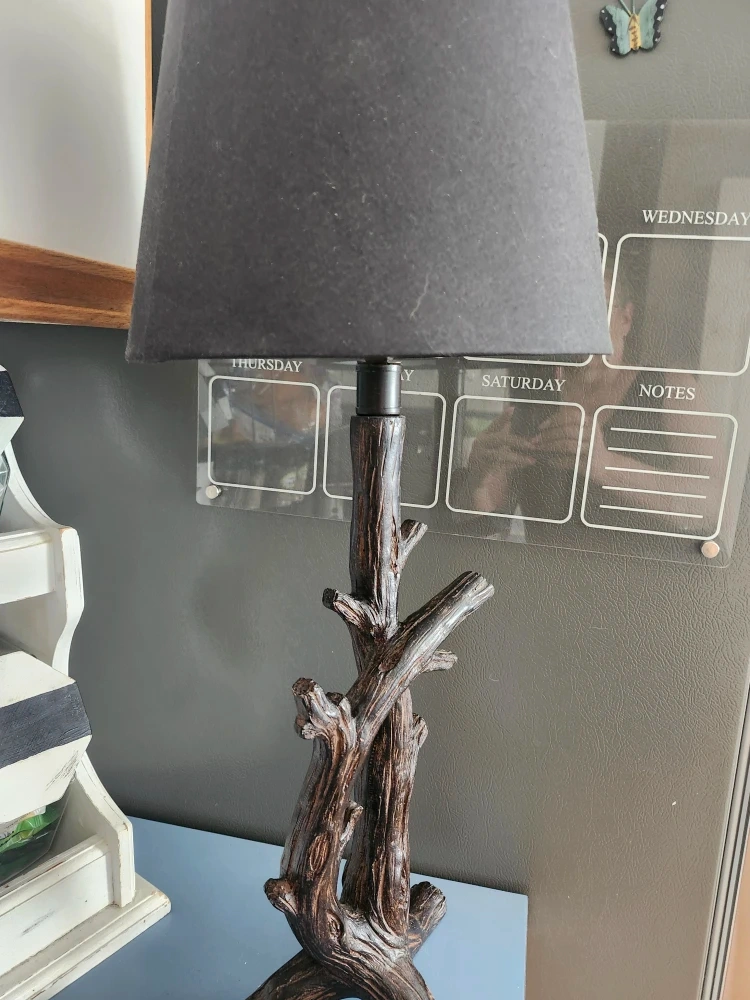 Selling a unique rustic table lamp with a wood branch style base and a dark lampshade. It's a great piece to add some character to any room!