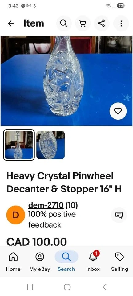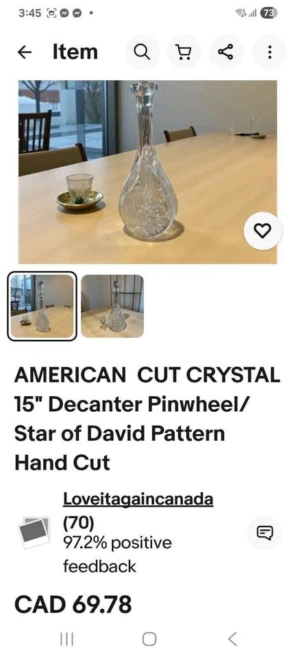 Buy & SellCrystal wine decantersCrystal wine decanters$25Never used. Pinwheel crystal wine decanter. Large/tall. Gorgeous toppers. 25.00 each See other ads StrathmoreWHERE TO MEETStrathmoreView MapSELLERGloriaStrathmore100 reviews0 chats·0 favorites·8 viewsSEND CHAT TO SELLERHi Gloria! I’m interested in your listing.Hi Gloria! I’m interested in your listing.Get the Karrot app to chatSign In to chat