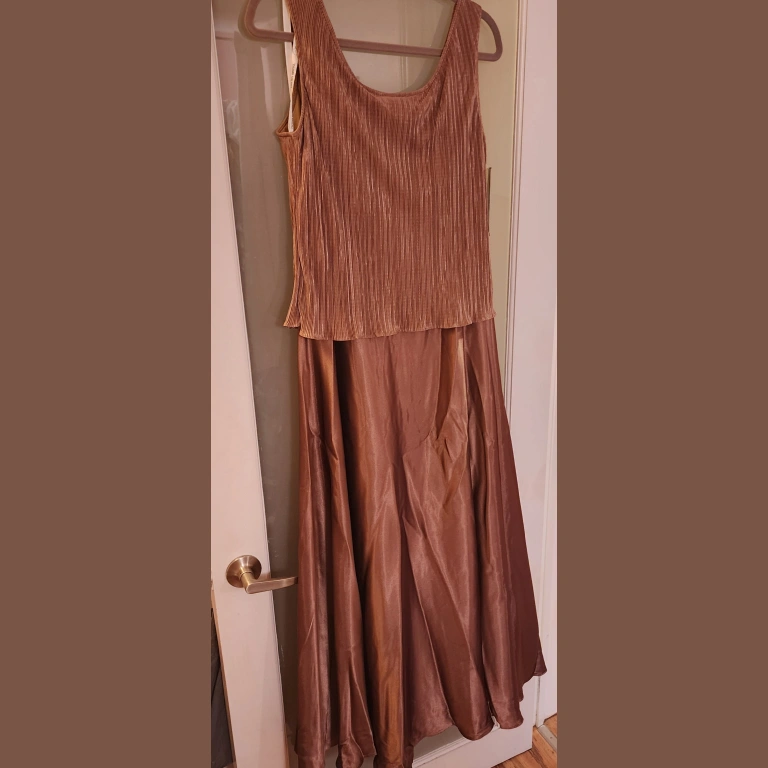 Brand New * Floor length David's Bridal Gown . Size 14. One piece but looks like a two piece. Small crinolin underneath the skirt. Tags still on . Coaco / Carmel nice neutral color. Perfect for mother of the bride ☺️❤️ or any formal event