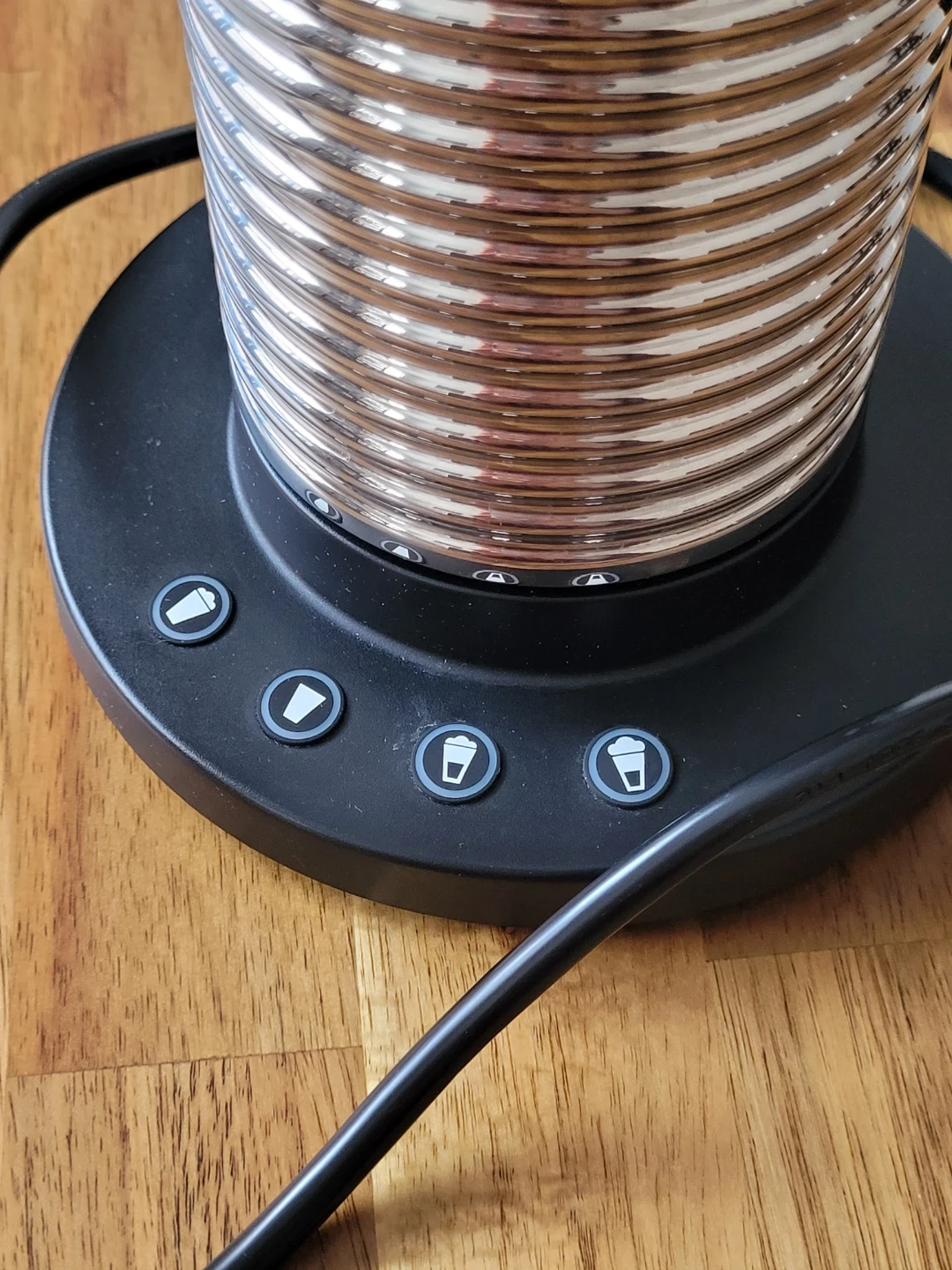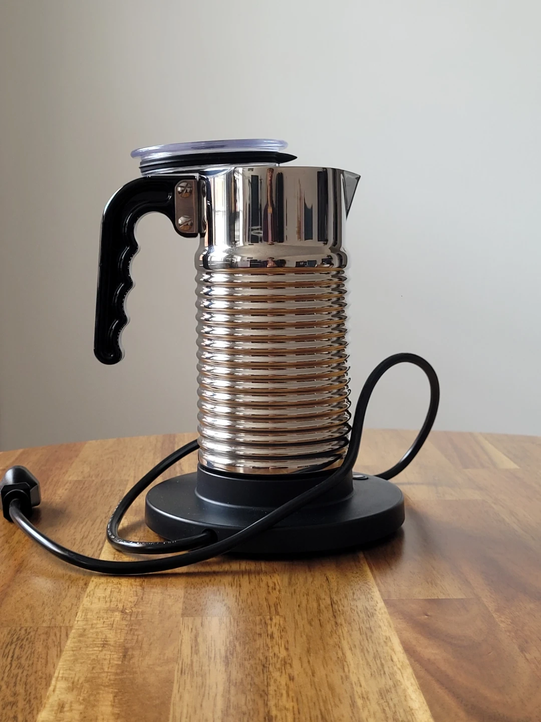 Main jug has a chrome finish and black ergonomic handle. Separates from the base, where you can choose between four options of hot and cold foams. Whisk attaches to the base via a magnet.
