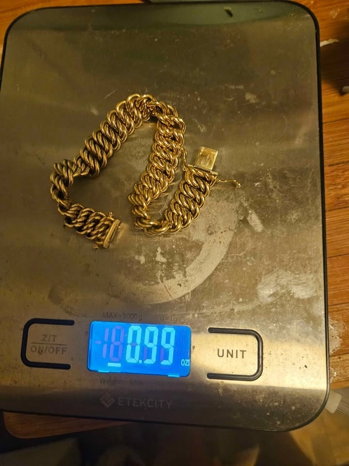 This bracelet is at least 60 years old and was passed down to me. It is marked '14k Italy' on the clasp and weighs just under an ounce at 27 grams. It's a bit tricky to get a clear picture of the clasp, but I've done my best.