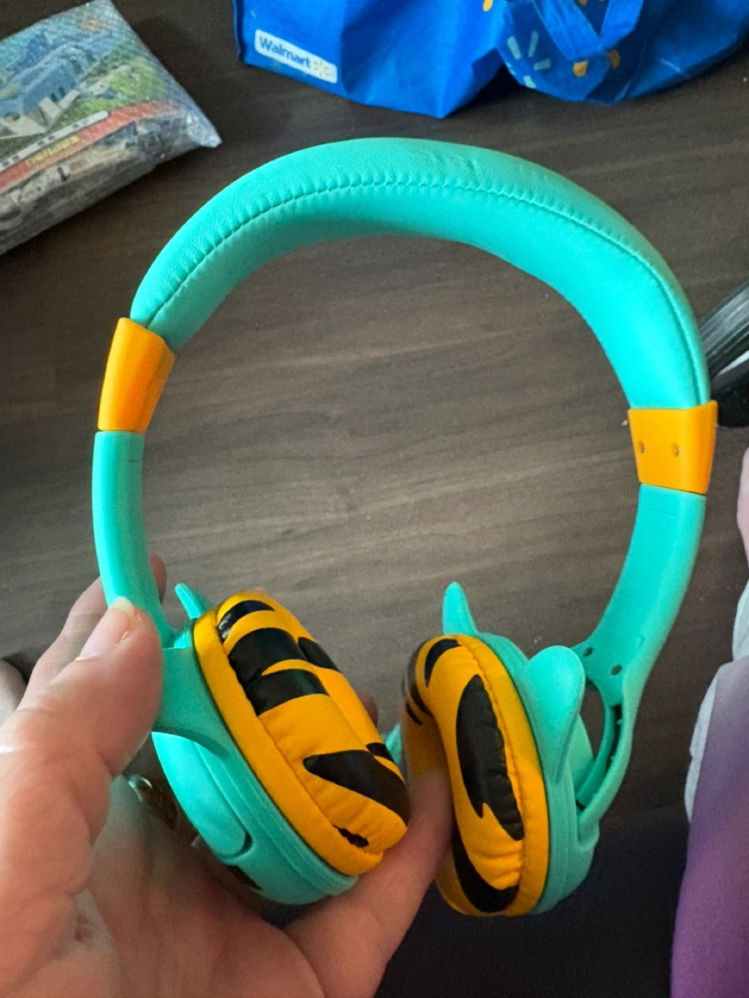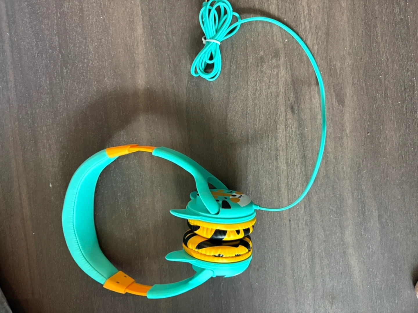 These teal and orange kids headphones feature a fun tiger design on the earcups. They have a comfortable padded headband and a wired connection for easy use. Perfect for young ones to enjoy their music or audiobooks!