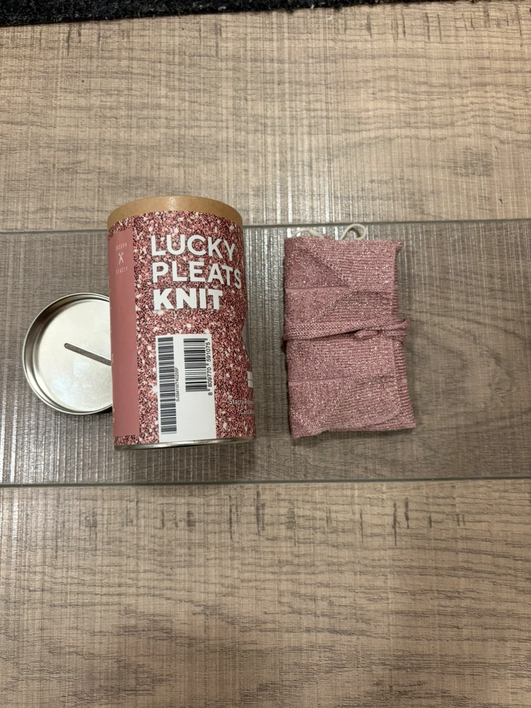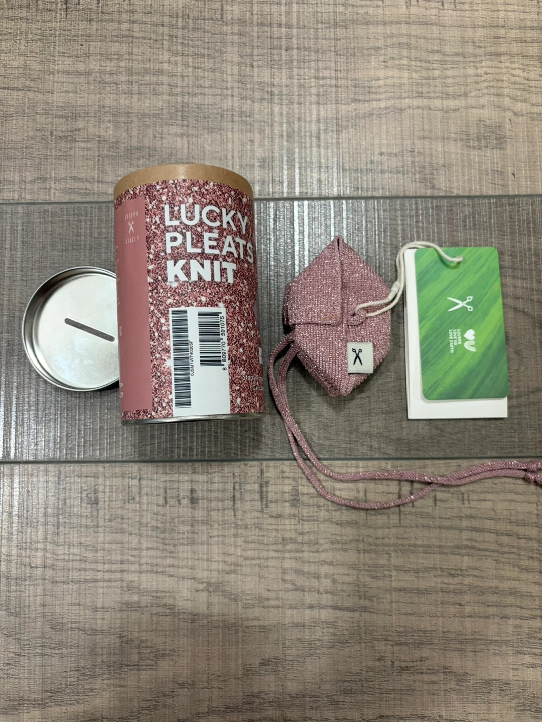 Brand new! This is a sparkly pink knit foldable card holder. It comes in its original tube packaging with a tag and a small case. It's made of a metallic thread blend.