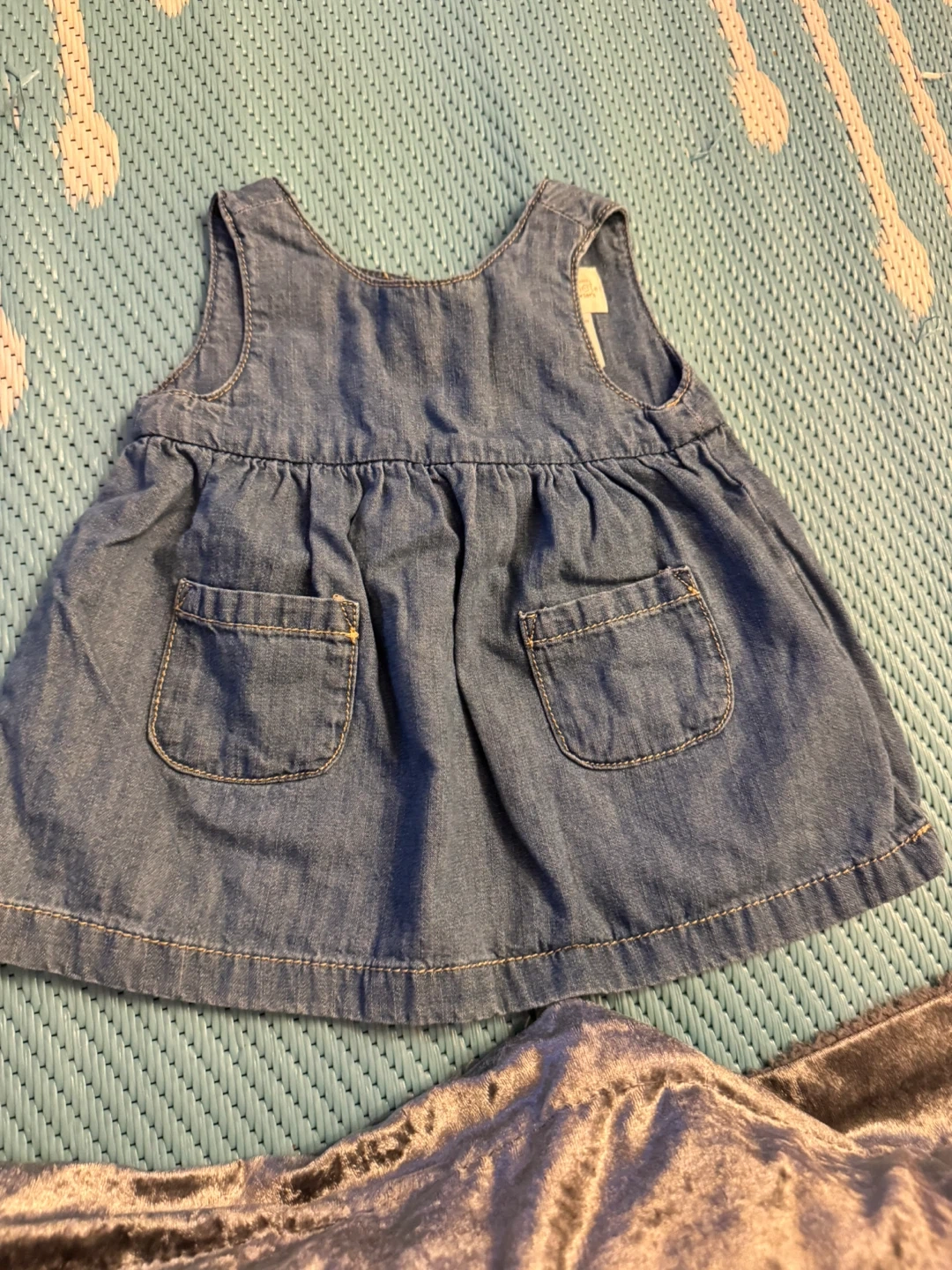 A sweet sleeveless denim dress for a baby. It features two front pockets and a gathered waist. Made of soft denim material.