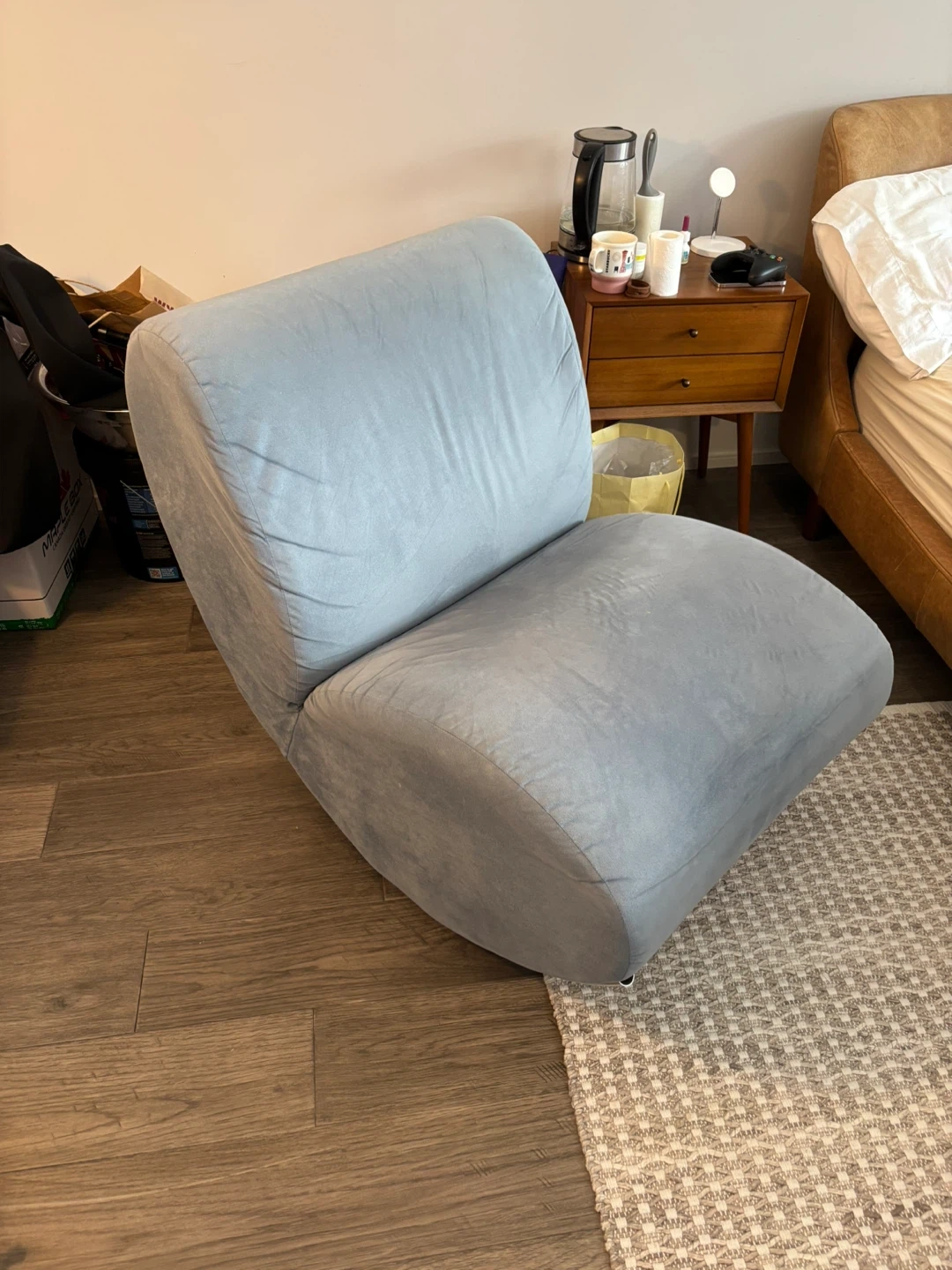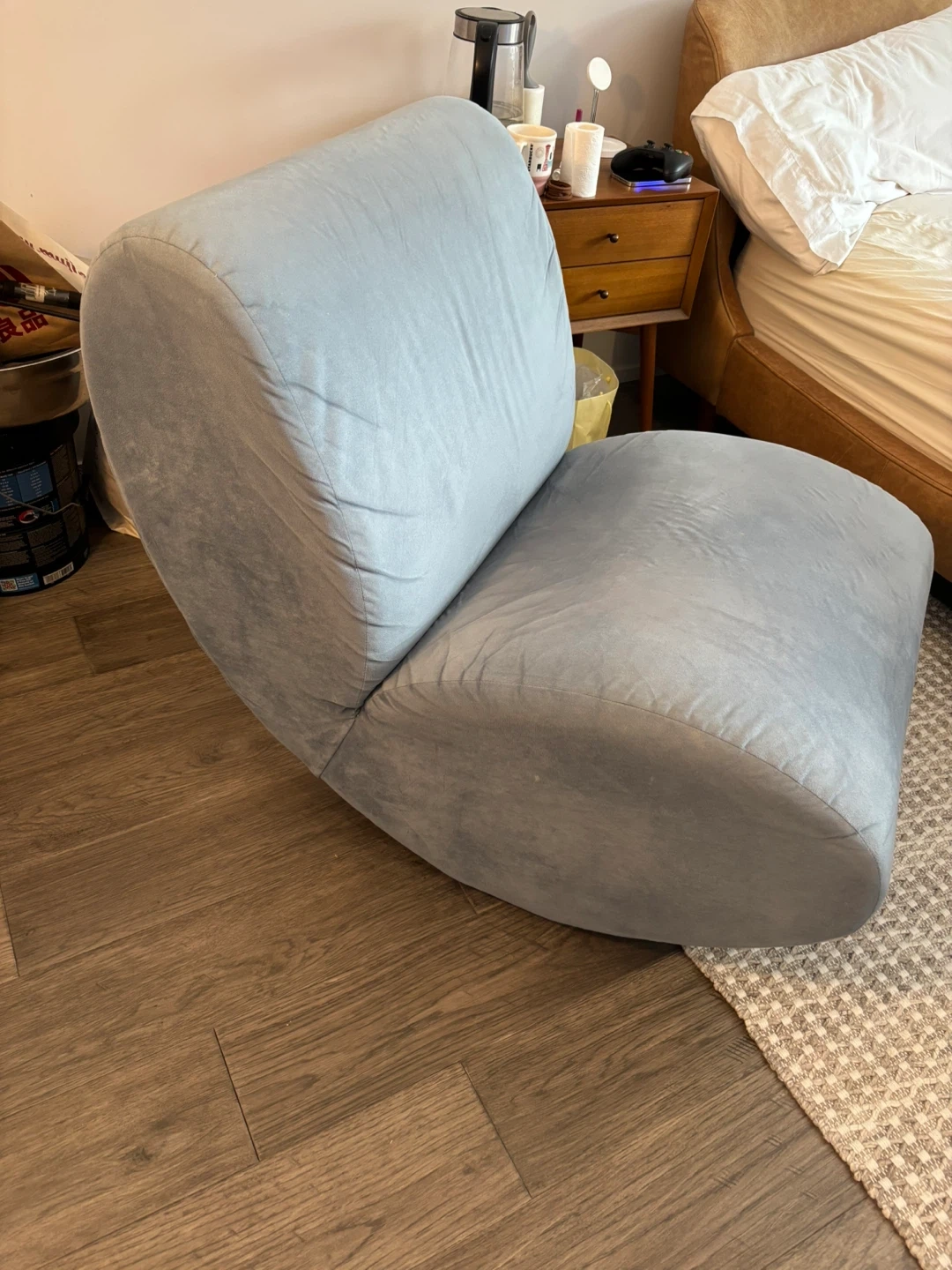 It's a comfy blue accent chair have rocker feature from EQ3. Measurements are 69 cm wide, 89 cm long, and 96 cm tall. This chair's soft fabric makes it a cosy spot to relax.