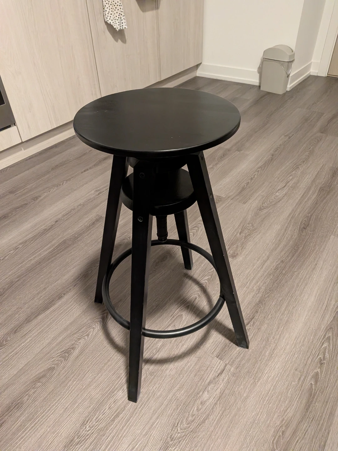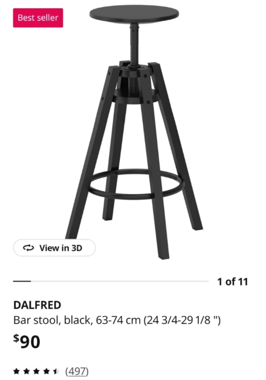This is the IKEA DALFRED bar stool in black. It's adjustable in height from 63-74 cm. This stool is great for a kitchen island or counter.