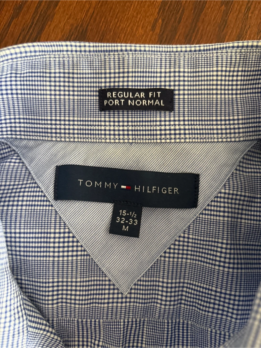 Tommy Hilfiger long-sleeve dress shirt. It's a regular fit in size medium with a blue plaid pattern. Made from a blend for comfort.
