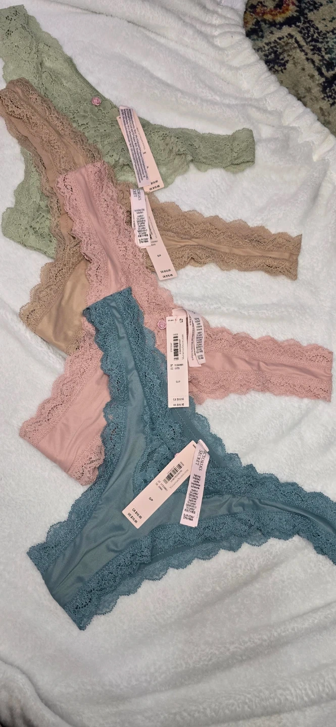 Set of five Victoria's Secret thong panties in various colors. Includes sizes S/P. Made with lace trim. Original tags attached.