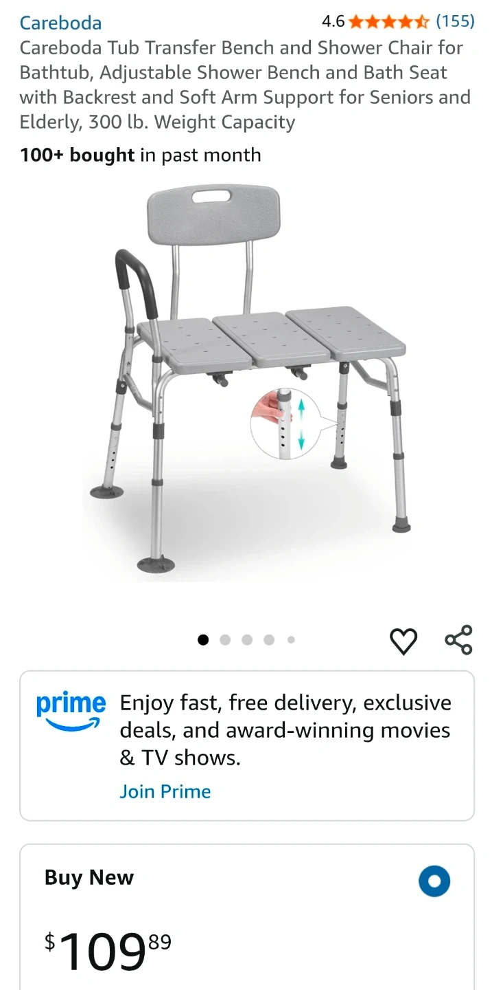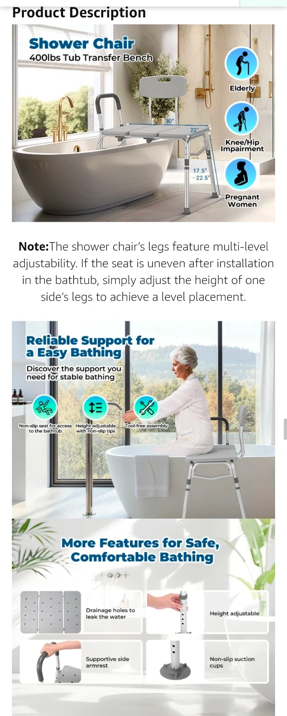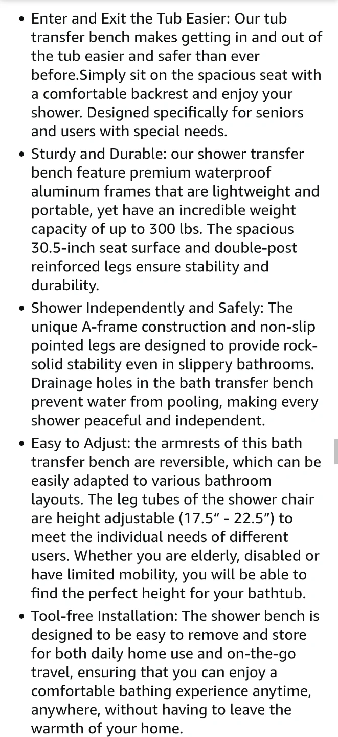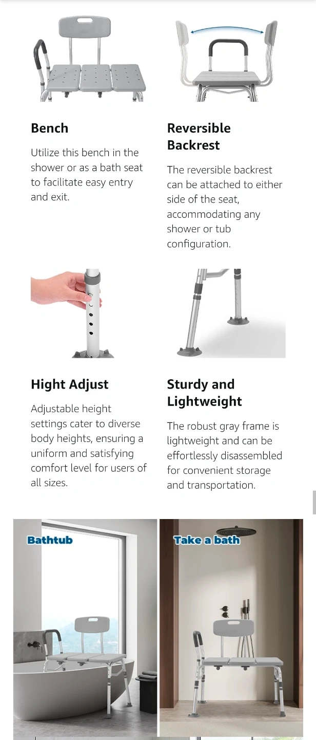 This is a new Careboda tub transfer bench and shower chair with a backrest. It's designed to make getting in and out of the tub easier and safer, especially for seniors or those with mobility issues. It features adjustable height legs, a reversible armrest and a sturdy, lightweight frame.