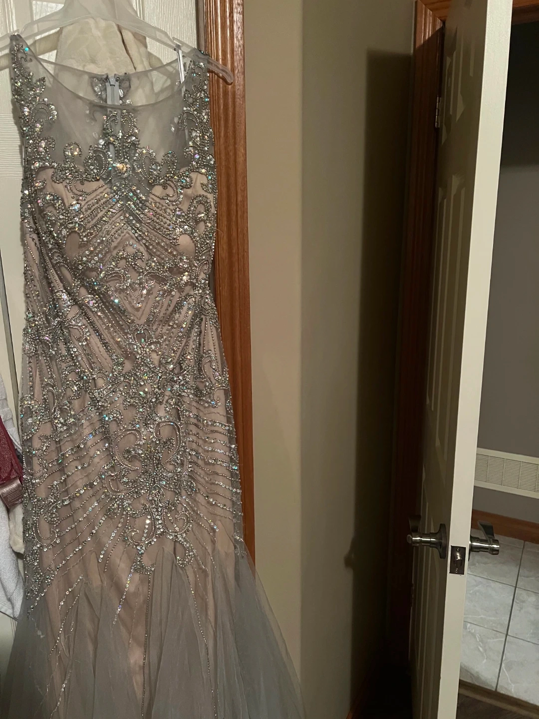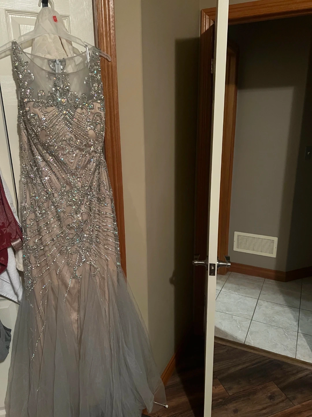 Stunning sleeveless formal gown with intricate beading and sequin details. Features a sheer neckline and a flowing skirt. Perfect for special occasions.