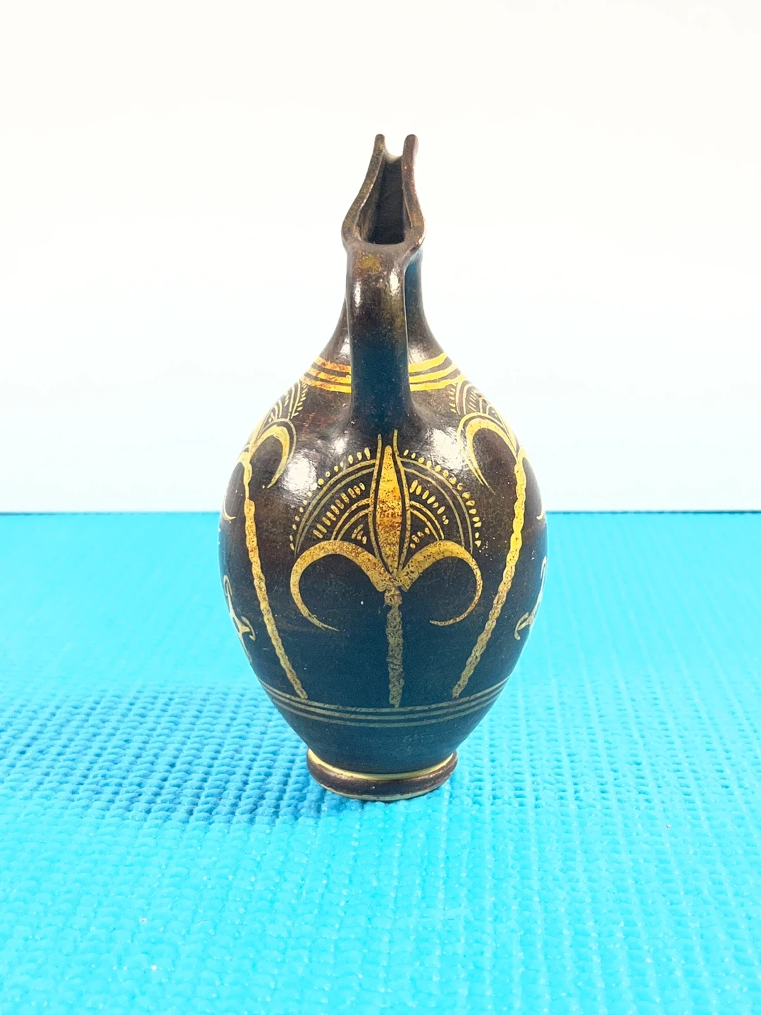 The handwritten inscription on the base confirms it is a "copy" of an ancient artifact from the Heraklion Archaeological Museum in Crete, specifically modeled after pottery from the late Minoan period (c. 1400 B.C.). The design is a variation of Kamares Ware, known for its dark backgrounds and vibrant, light-colored floral or geometric patterns.