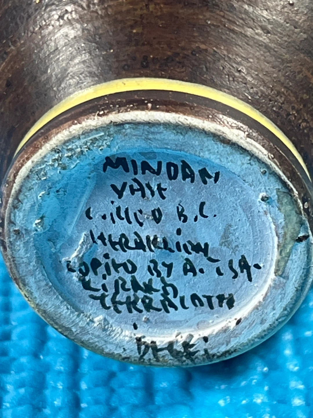 The handwritten inscription on the base confirms it is a "copy" of an ancient artifact from the Heraklion Archaeological Museum in Crete, specifically modeled after pottery from the late Minoan period (c. 1400 B.C.). The design is a variation of Kamares Ware, known for its dark backgrounds and vibrant, light-colored floral or geometric patterns.