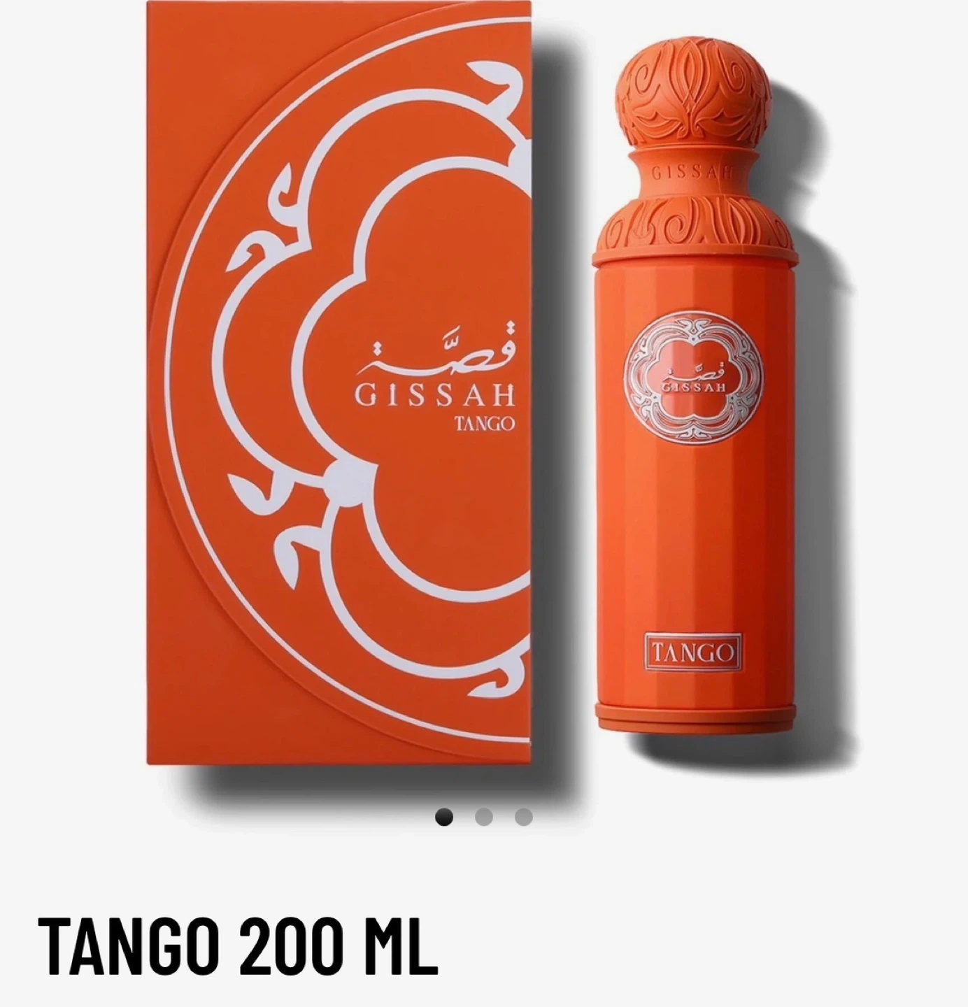 This is the Gissah Tango perfume. It comes in a 200ml bottle with its original box. The bottle and box are bright orange.