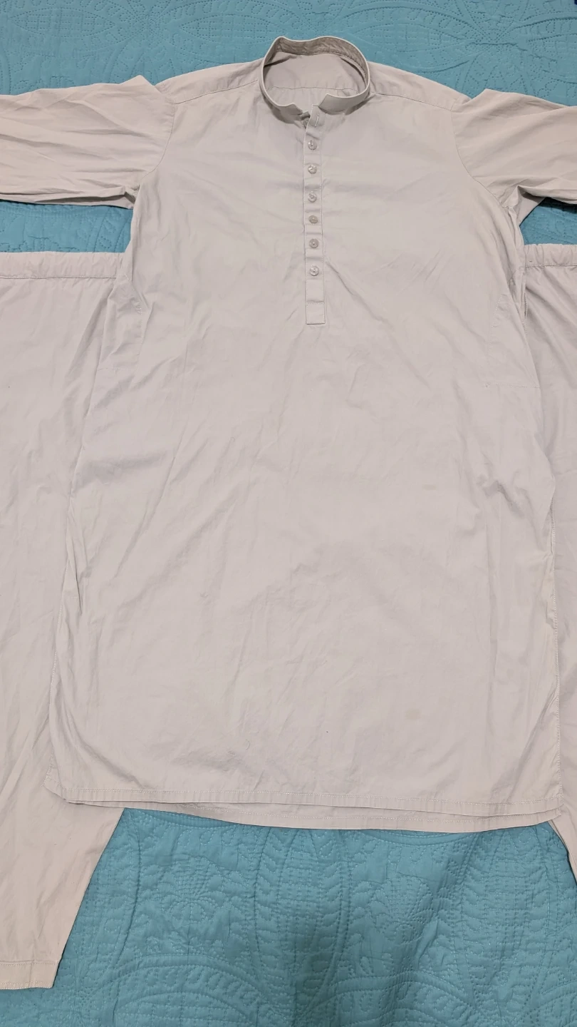 Selling a men's kurta pajama set in light grey. The sleeve length is about 8 inches, and the total length of the kurta is approximately 24 inches. It's in good condition and ready for a new home! Used 4 times. if anybody is interested.