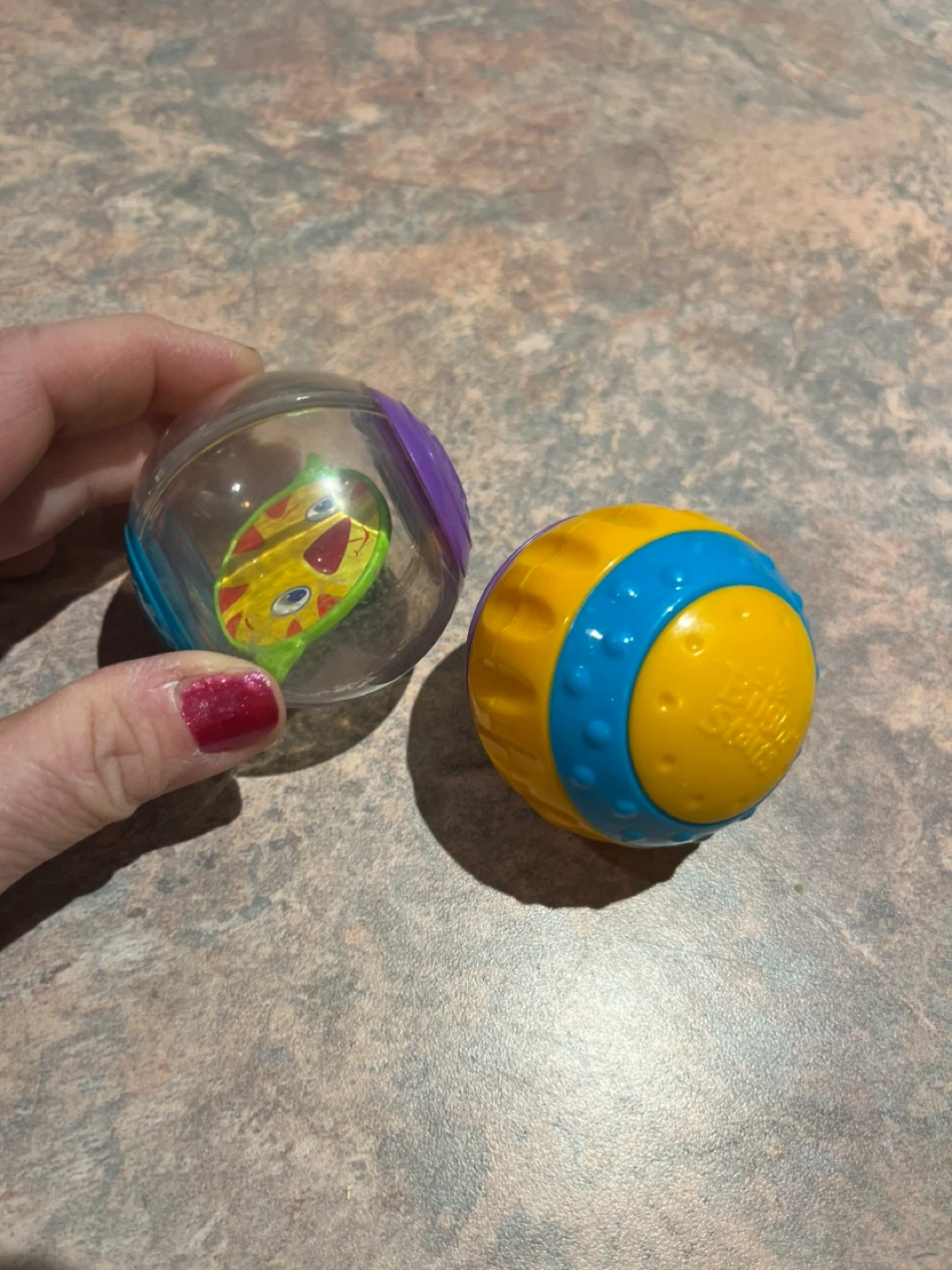 Two colourful baby rattles from Bright Starts. One is a clear ball with a spinning toy inside and the other is a textured ball. They're great for little hands to grasp and shake!