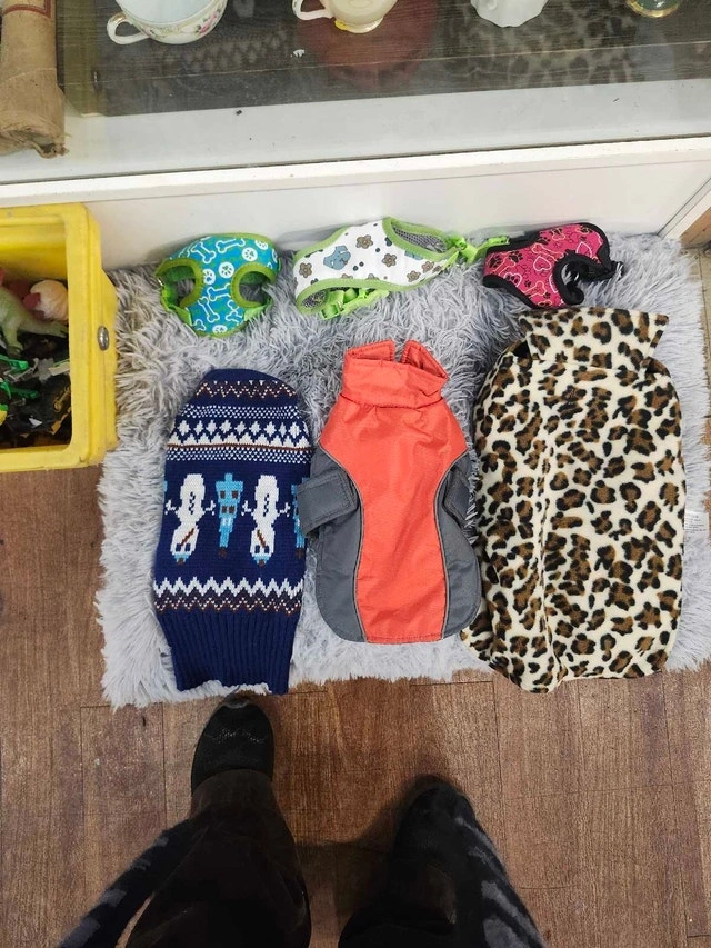 I am selling a variety of dog clothes and harnesses, perfect for keeping your furry friend stylish and comfortable. This collection includes sweaters, winter coats, and harnesses in various sizes and designs. All items are in good condition and ready for a new home. Sweaters: Cozy knit sweaters to keep your dog warm during chilly days. Winter Coats: Insulated coats for extra protection against the cold. Harnesses: Safe and comfortable harnesses for walks and outdoor activities. These items are priced to sell, offering great value for quality pet apparel. Available now, because if the ad is up, it's still available! Cash accepted.
