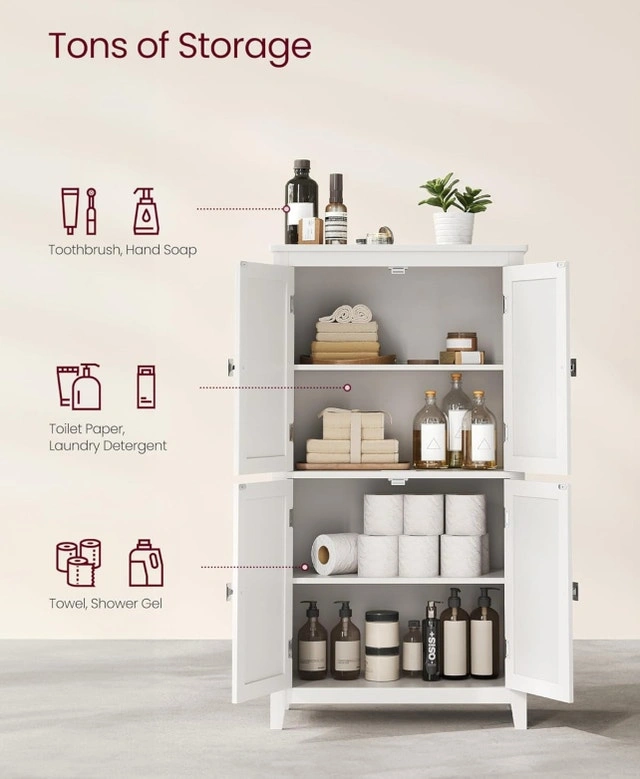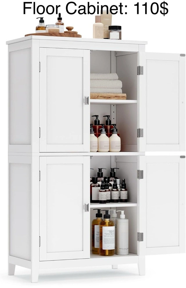 This new bathroom cabinet offers tons of storage with its multiple shelves and double-door design, perfect for organizing all your bathroom essentials. It measures 43.3 inches in height, 23.6 inches in width and 11.8 inches in depth and can hold up to 300 lbs (136 kg). The white finish ensures it will fit into any bathroom decor. Specifications: Height: 43.3 inches (110 cm), Width: 23.6 inches (60 cm), Depth: 11.8 inches (30 cm), Shelf Depth: 9.9 inches (25.1 cm), Weight Capacity: 300 lbs (136 kg). This cabinet will look wonderful in your bathroom, providing a fresh space to display towels and toiletries, while keeping things neat and tidy. If you see this ad, rest assured, it's still available!