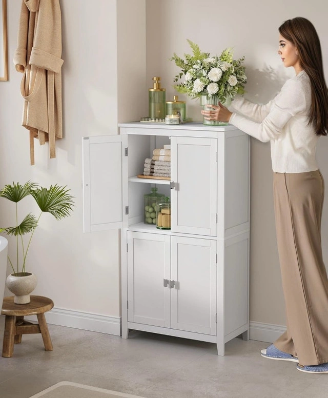 This new bathroom cabinet offers tons of storage with its multiple shelves and double-door design, perfect for organizing all your bathroom essentials. It measures 43.3 inches in height, 23.6 inches in width and 11.8 inches in depth and can hold up to 300 lbs (136 kg). The white finish ensures it will fit into any bathroom decor. Specifications: Height: 43.3 inches (110 cm), Width: 23.6 inches (60 cm), Depth: 11.8 inches (30 cm), Shelf Depth: 9.9 inches (25.1 cm), Weight Capacity: 300 lbs (136 kg). This cabinet will look wonderful in your bathroom, providing a fresh space to display towels and toiletries, while keeping things neat and tidy. If you see this ad, rest assured, it's still available!