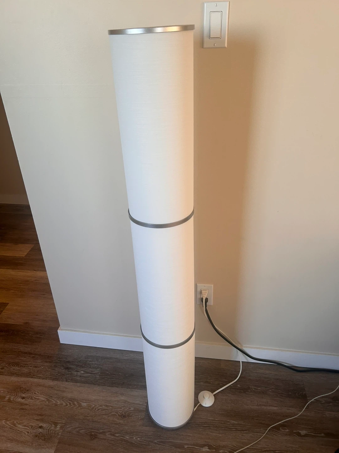 This is a modern cylinder floor lamp that gives off a nice ambient light. It would look great in any living room or bedroom! It features a white fabric shade with silver accents.